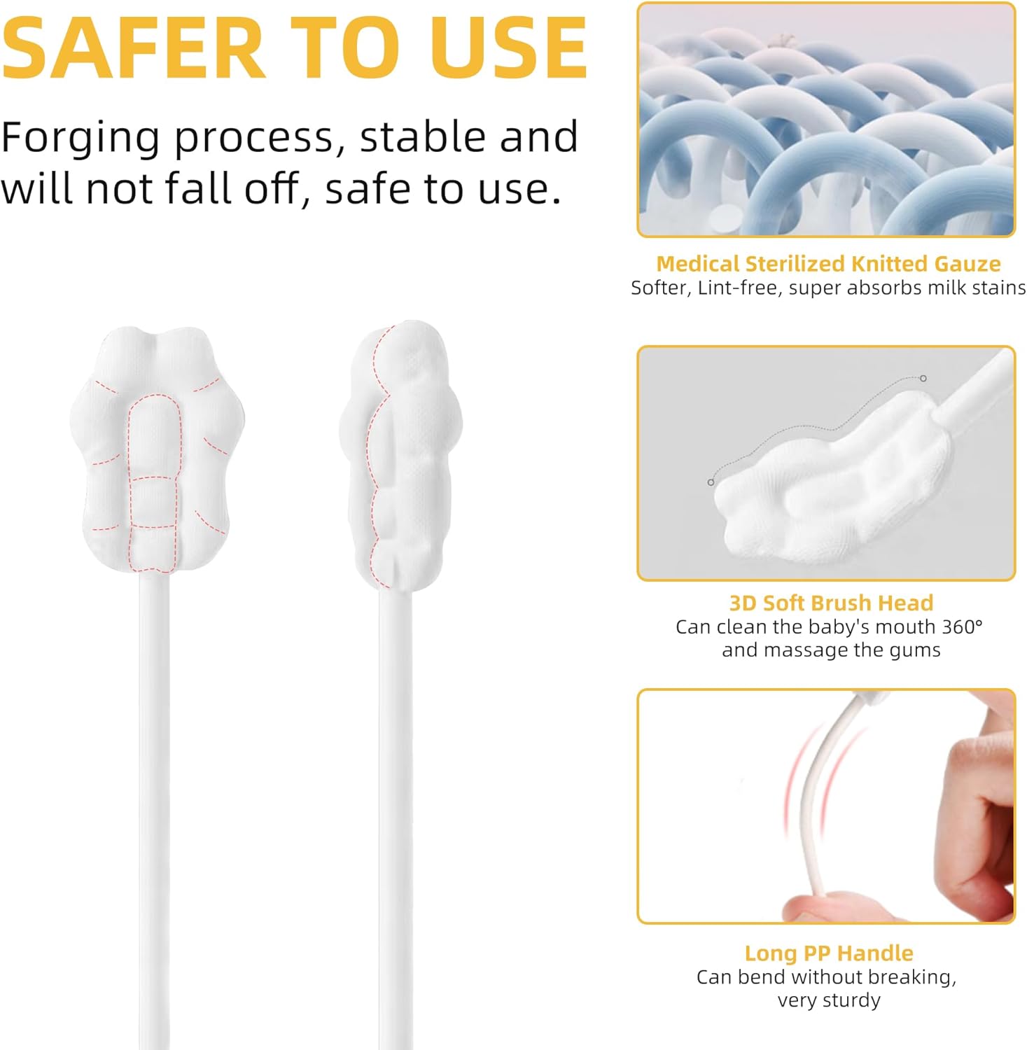 - UPGRADED Cleaning Effect: No Glue, No Lint, No Smell. The soft brush head is made of medical-grade sterilized knitted gauze, which has strong adhesion and upgraded cleaning effect. The PP handle is strong, flexible, BPA free and long enough to easily reach all parts of your baby's mouth.
