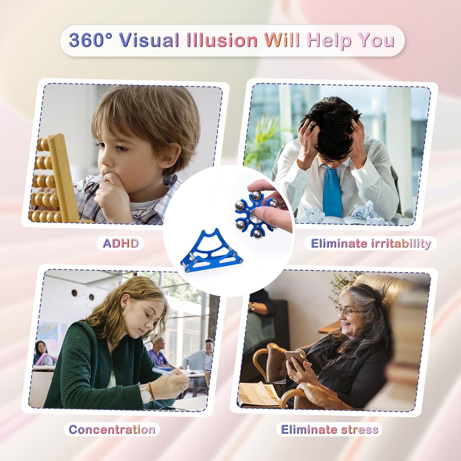 • Metal Fidget-Spinner: 2.5 Inch & 3.9 Oz. You can easily put it in your pocket and take it with you wherever you go to satisfy your restless hands. With the metal bracket, you can combine it into an kinetic desk Ferris-Wheels-spinner toy.