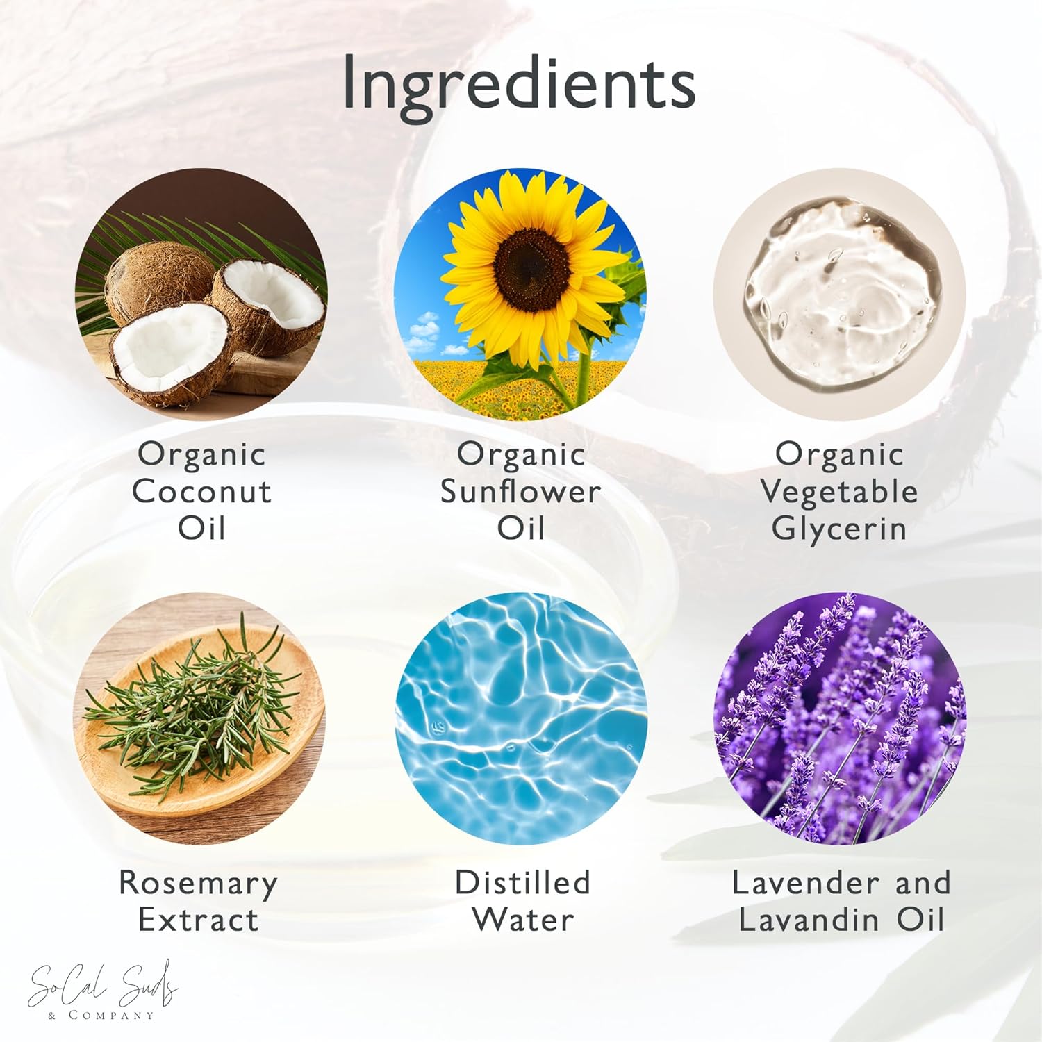 - GENTLE CARE IN EVERY BUBBLE: SoCal Suds & Company's foaming baby wash and shampoo features saponified oils of organic sunflower and coconut. This gentle formula is enriched with distilled water, organic vegan glycerin, and rosemary extract, offering a nurturing cleanse that honors the delicate balance of any skin type. Embodying our commitment to natural and organic care.