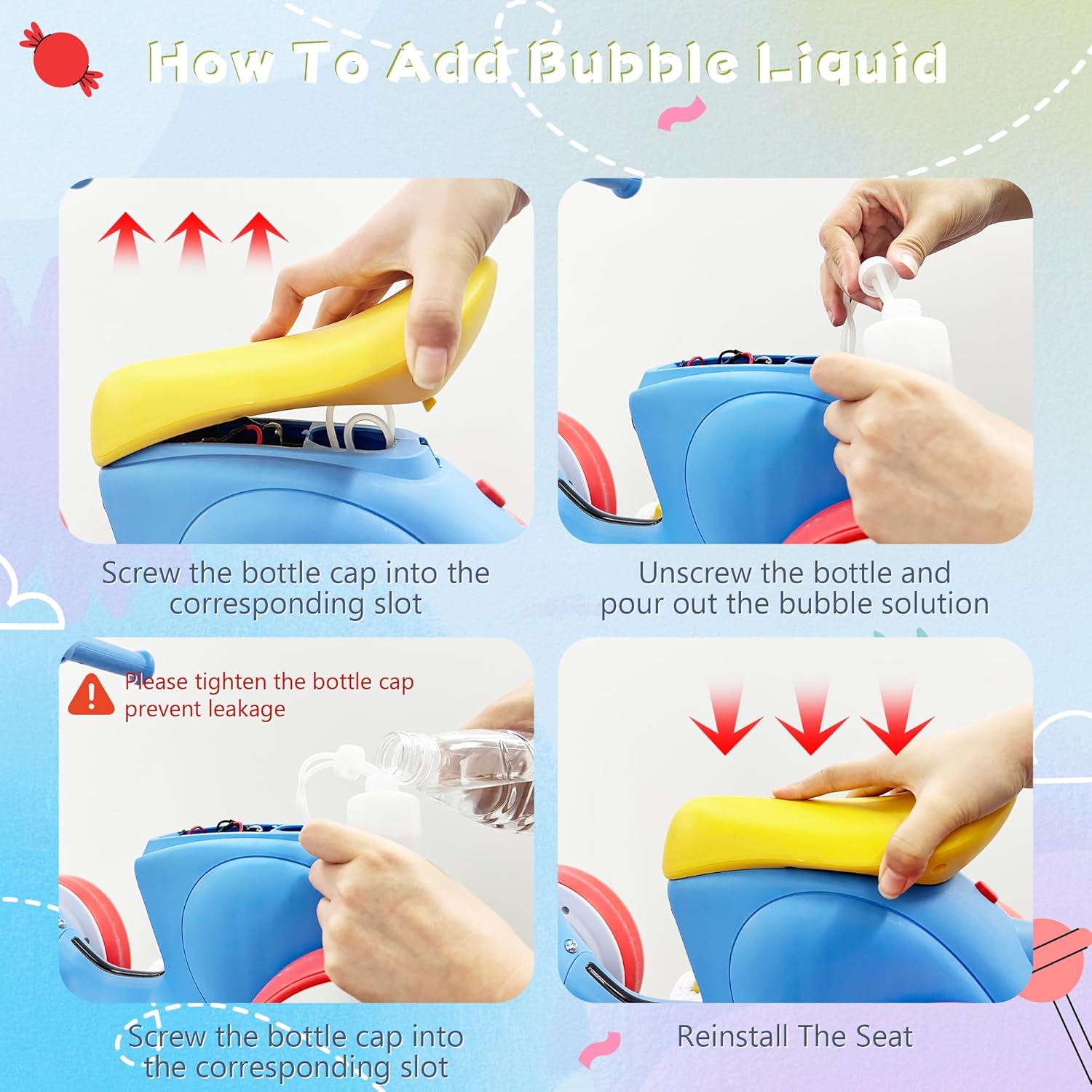 - Exciting Features for The Bubble Bike:The thoughtful design includes bubble devices, light effects, music functions, and whistles, adding more fun to the driving experience. Parents can ensure safe driving directions using the remote control. The use of plastic material instead of metal makes the ride-on toy lighter, more compact, and easy to store and carry. The non-slip, wear-resistant wheels are gentle on floors and allow the baby to ride indoors or outdoors.