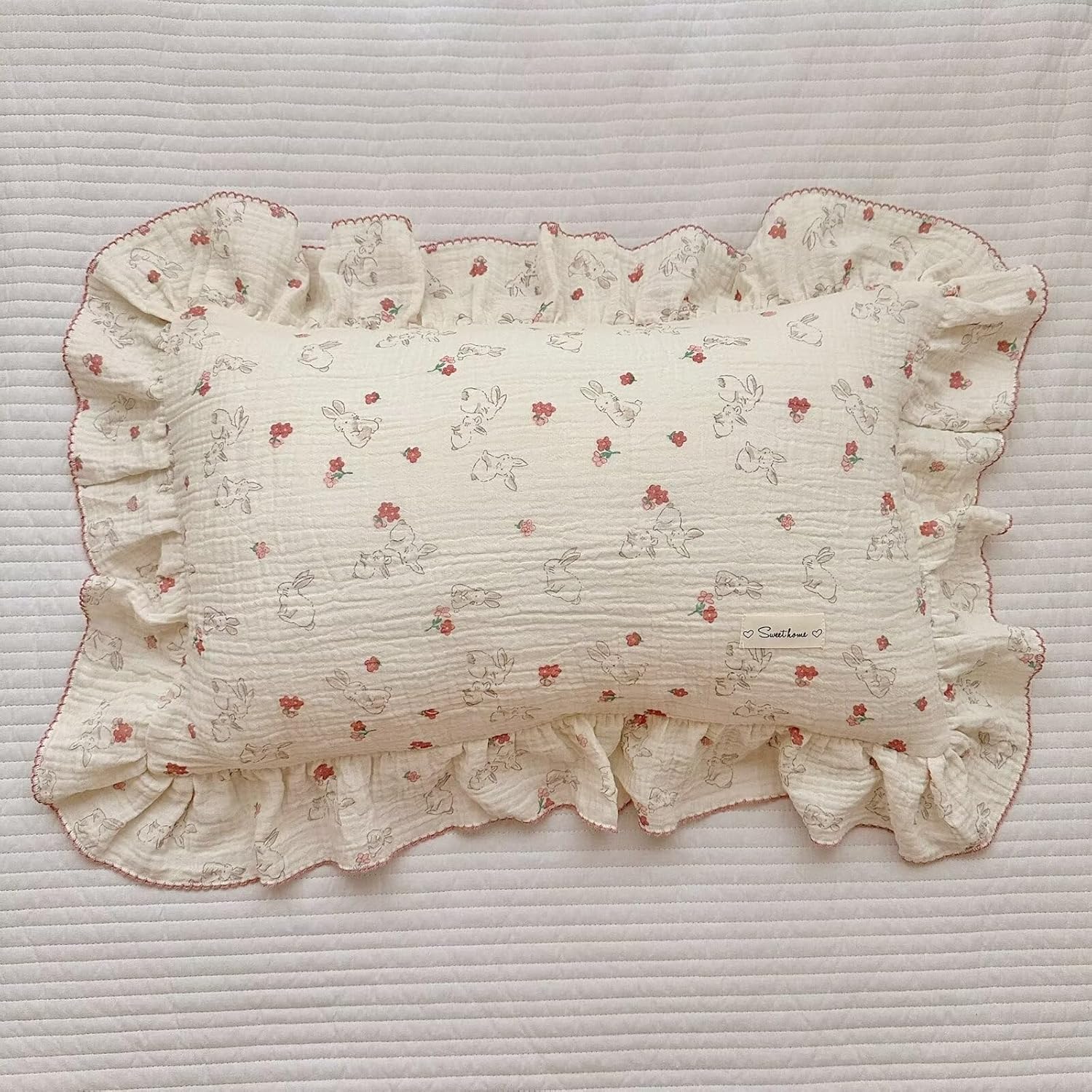 BuLuTu Cute Flower Rabbit Toddler Pillowcase for Girls Boys Soft Breathable Muslin Cotton Kids Pillow Covers, Animal Themed Small Pillow Case for Crib/Toddler Bed, 14"x20", Envelope Closure