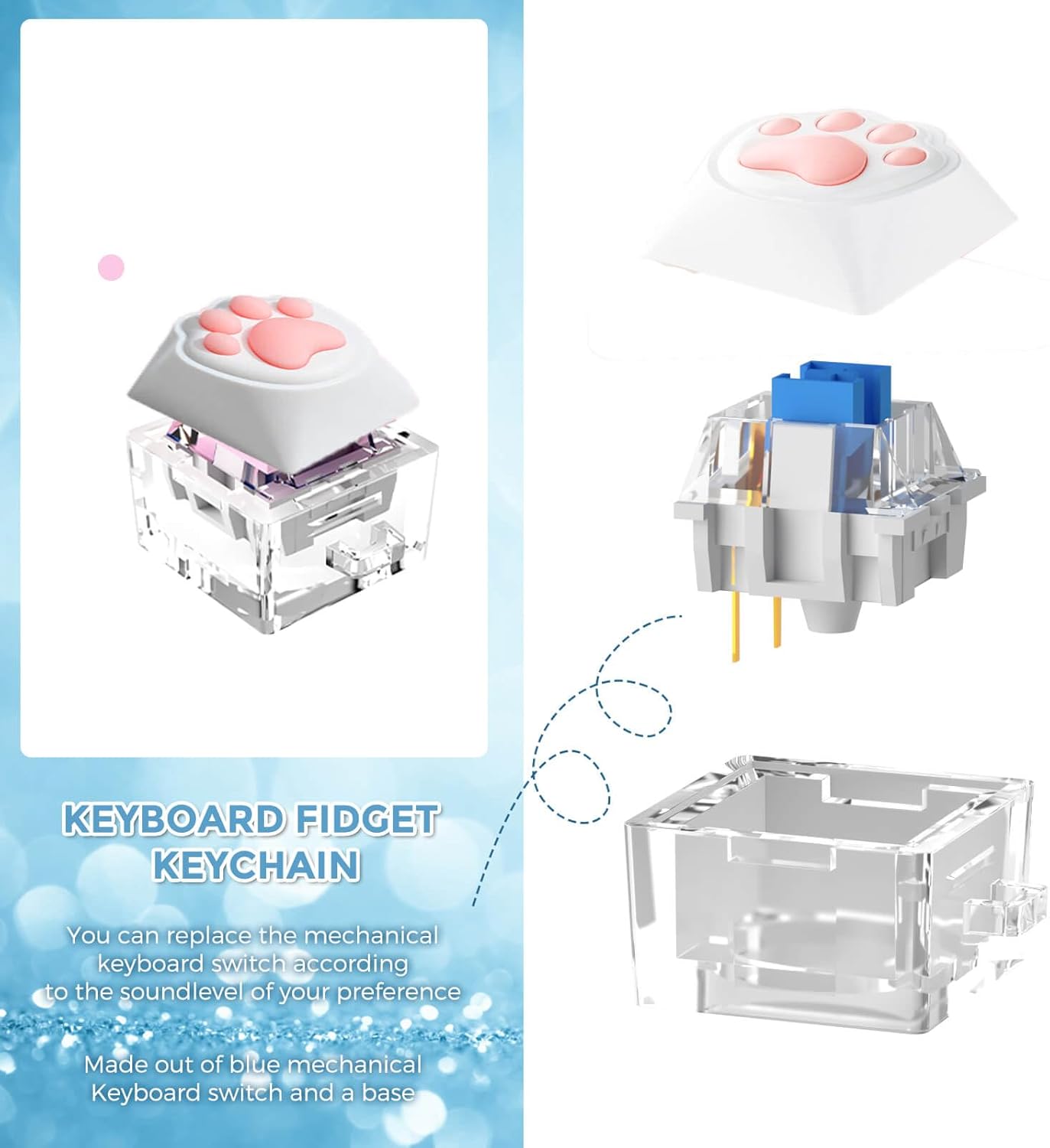 - Fidget Toys: Cute Cat's paw Fidget Keyboard Keychain;This is a color changing keyboard fidget with keychain,the colorful lights inside the keyboard will light up when you press the keyboard button