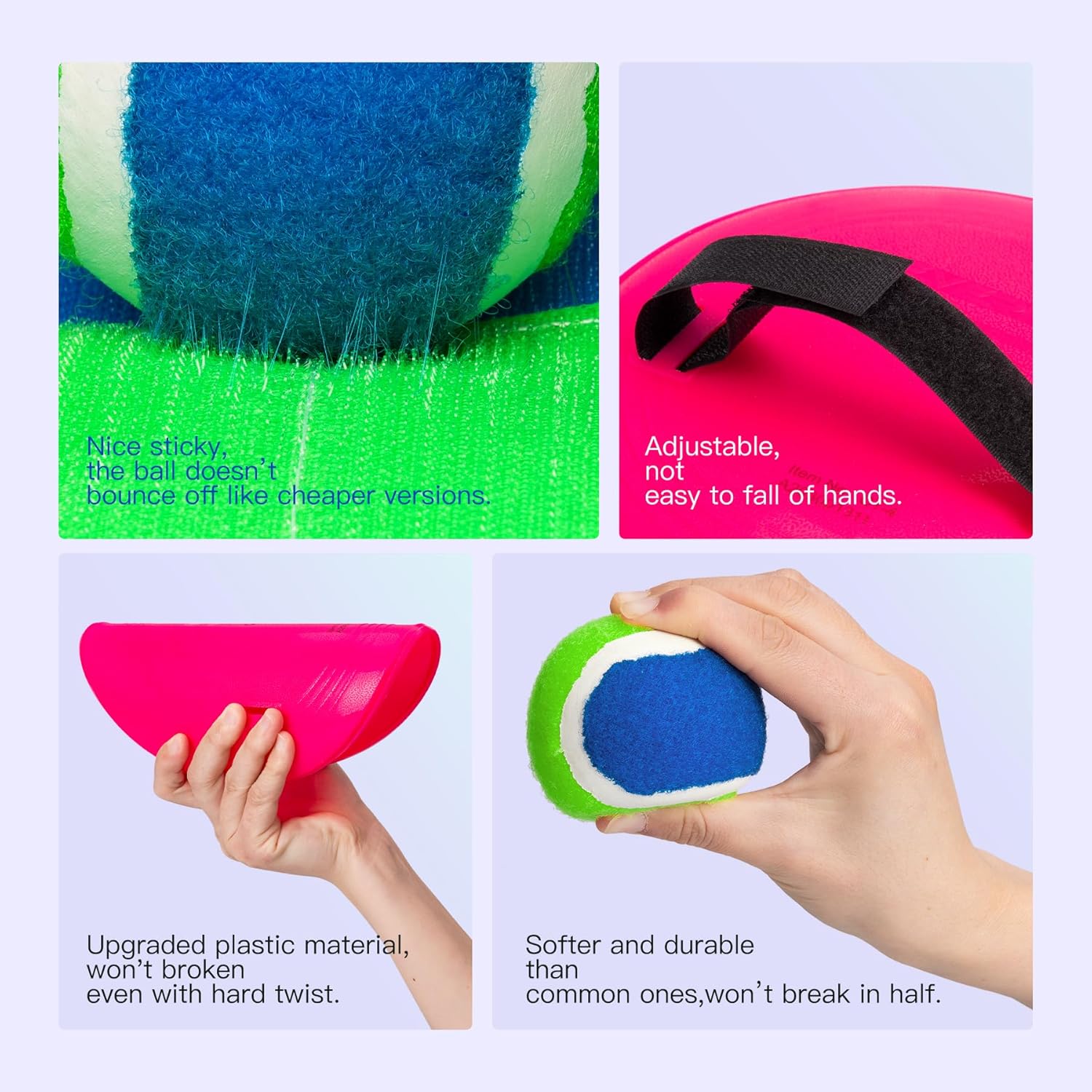 • 【Upgraded Lawn/Beach Paddles Ball】We use 100% new unbreakable materials with high toughness; Criss-crossed stitches make the sticky cloth tightly adhere to the plastic disc, the new version is durable and stronger than old version. Features water resistant, our toss and catch ball game can be played wherever indoor & outdoor, at beach or pool, backyard, in the park or garden.