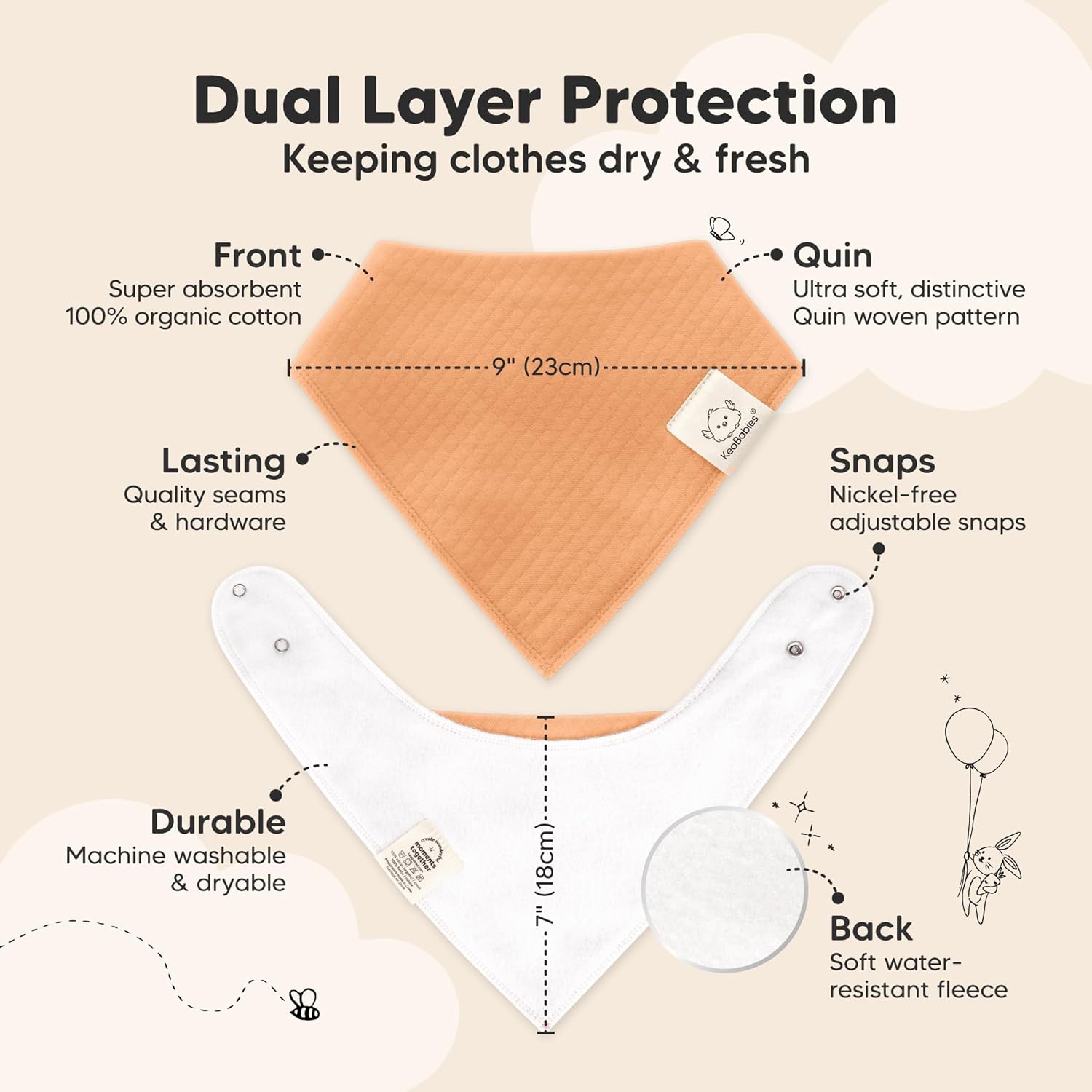 - Super Absorbent - Our organic baby drooling bibs are made with 100% organic cotton (GOTS-certified) Quin fabric and backed with water resistant fleece for added absorption. This dual layer design helps to keep your baby clean and fresh all day long.