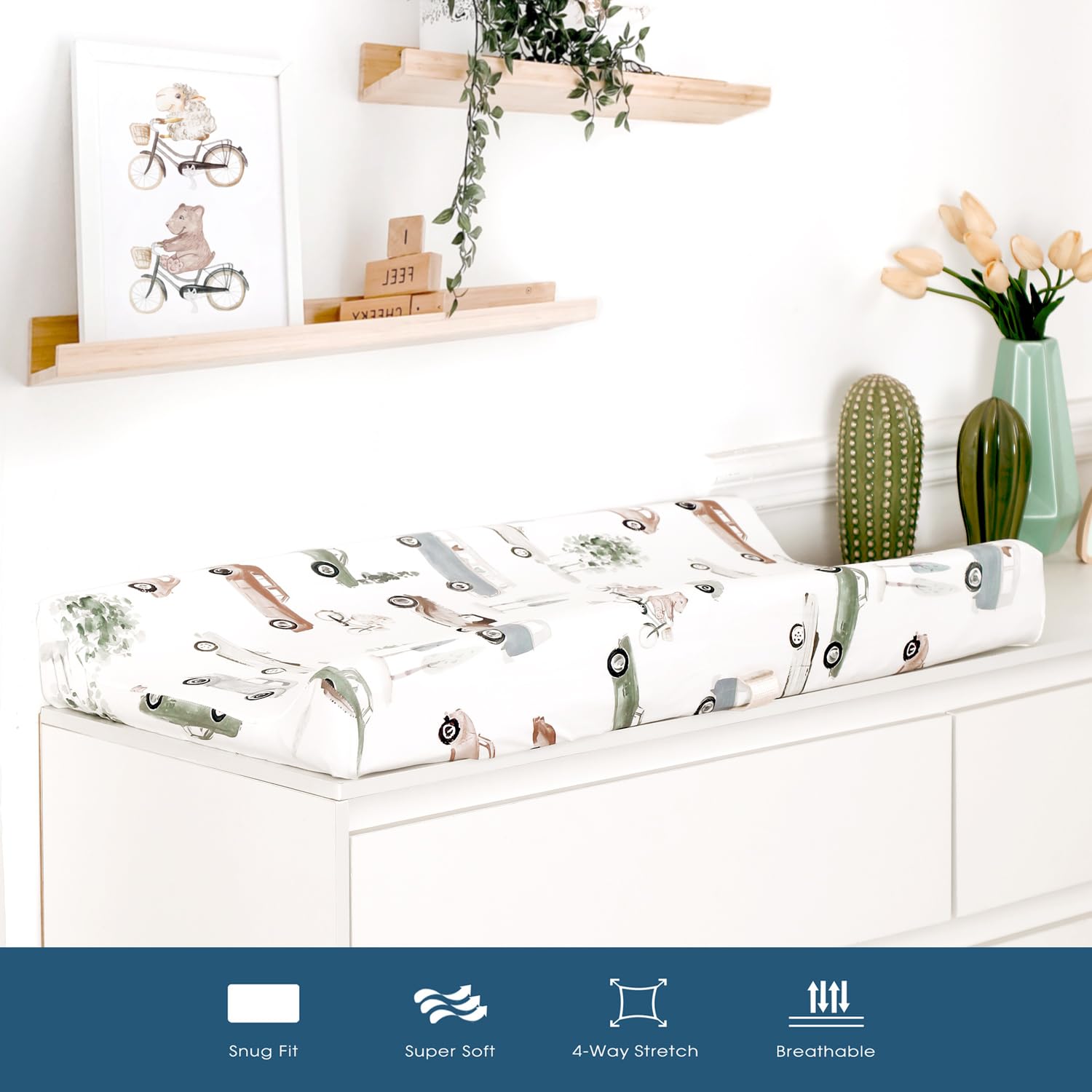 GRSSDER Stretch Ultra Soft Jersey Knit Changing Pad Cover Set 2 Pack, Change Table Pad Covers Fit 32"/34" x 16" Pads Safe and Snug, Pretty Diaper Changing Pad Covers of Cars Print