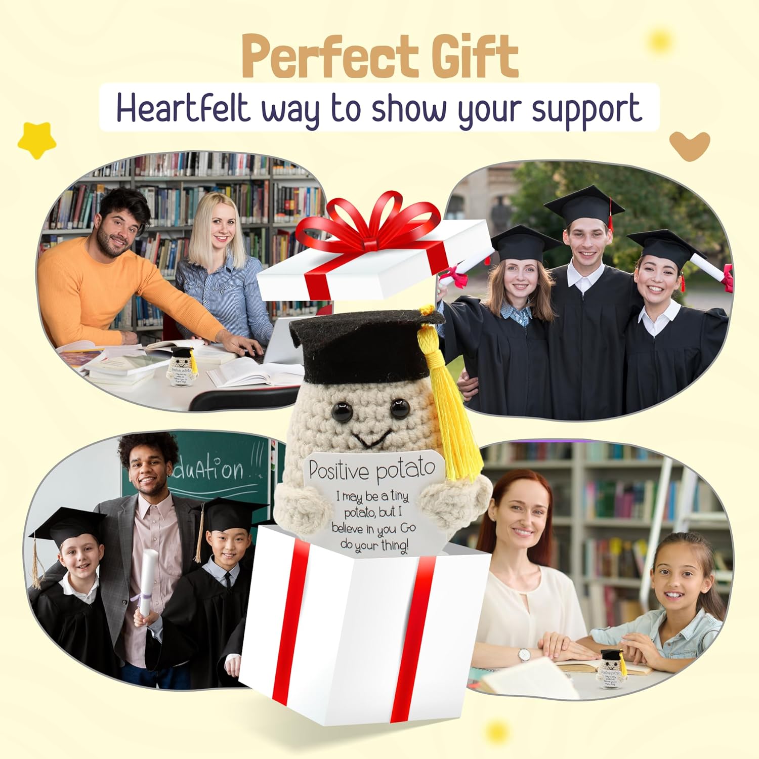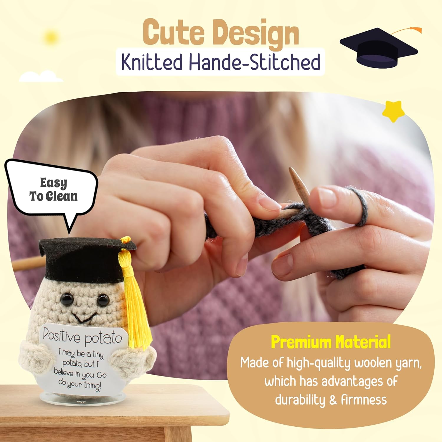 - Spread Positivity - Each potato doll comes with a funny and encouraging message card, spreading positivity and good vibes. This adorable graduation gift not only adds charm to any space but also serves as a meaningful reminder of the journey ahead.