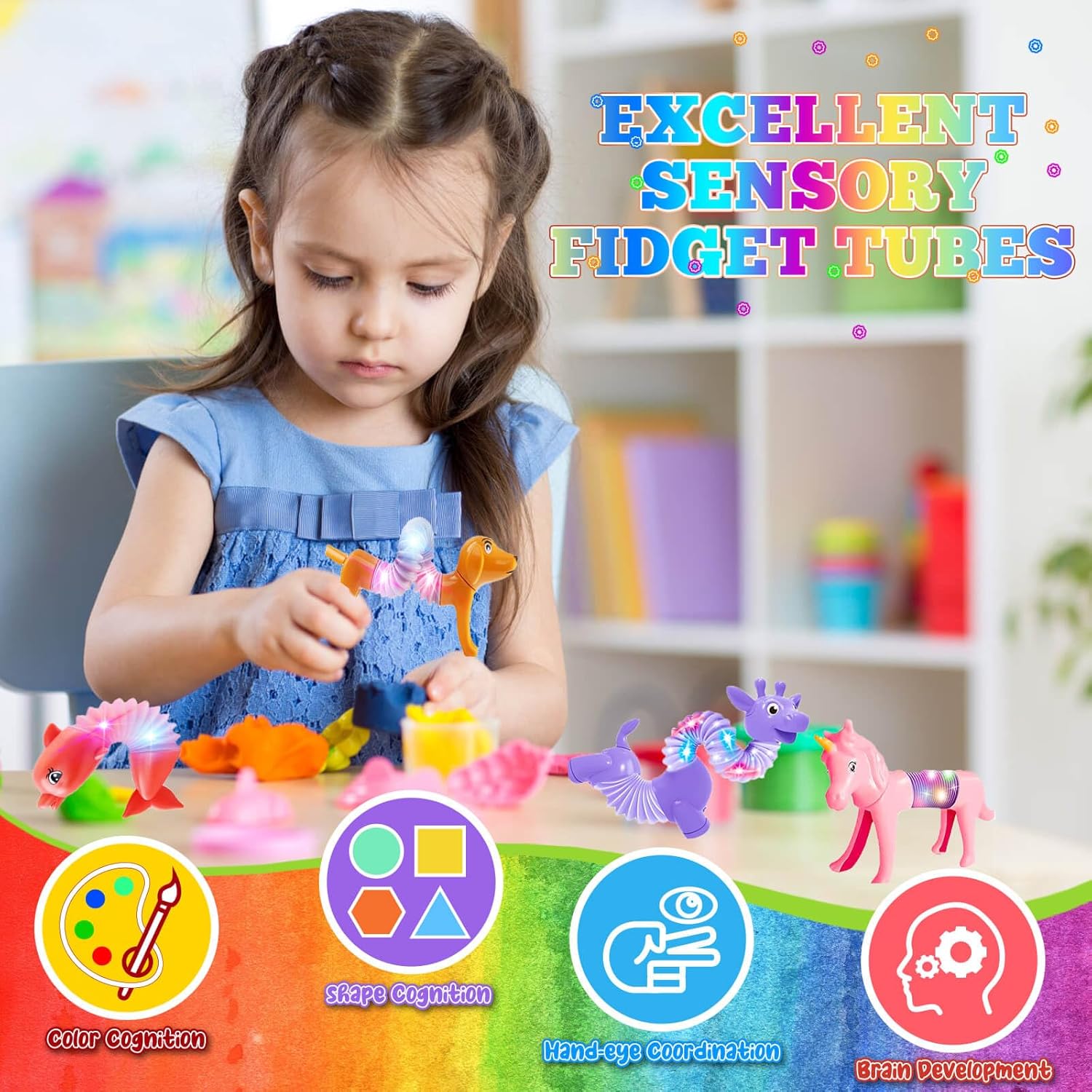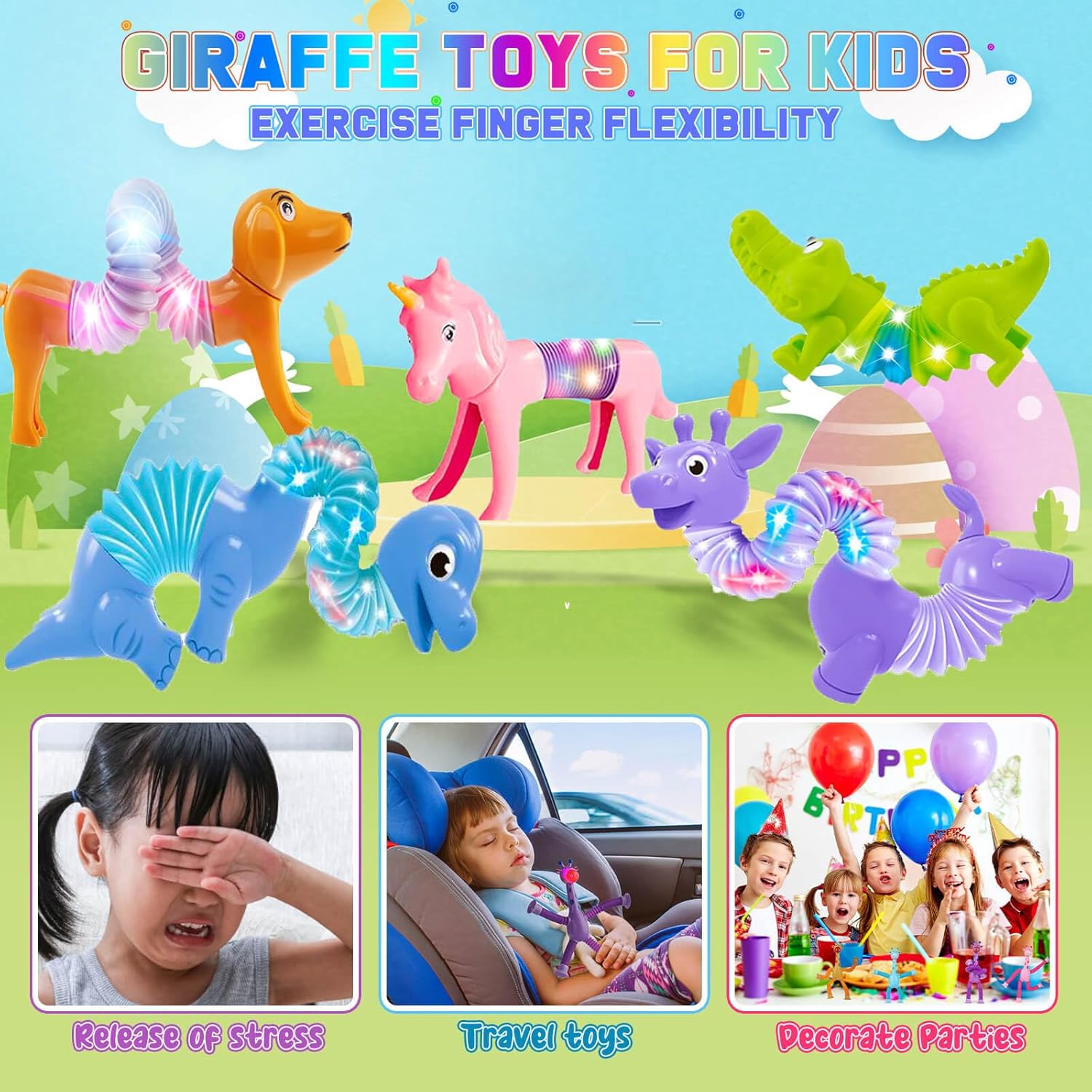 - LED Animal Pop Tubes: The sensory fidget toy set comes with LED lights,Shake it and it will flash;This pop tubes have 6 different animal shapes including long-necked dinosaurs, giraffes, unicorn, dogs, dolphins and crocodiles