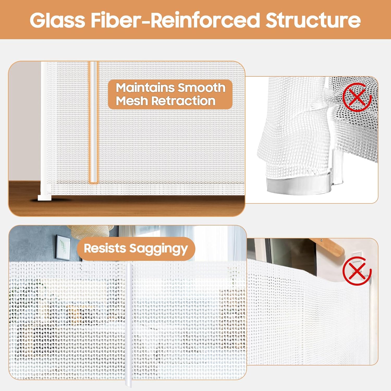 - 【Fiberglass Reinforced】The upgraded retractable baby gate now includes fiberglass support strips, which not only prevent kids and pets from going under the mesh, but also reduce wrinkling of the mesh. The retractable mesh gate expands smoothly without getting stuck, making it smoother and more effortless to use.