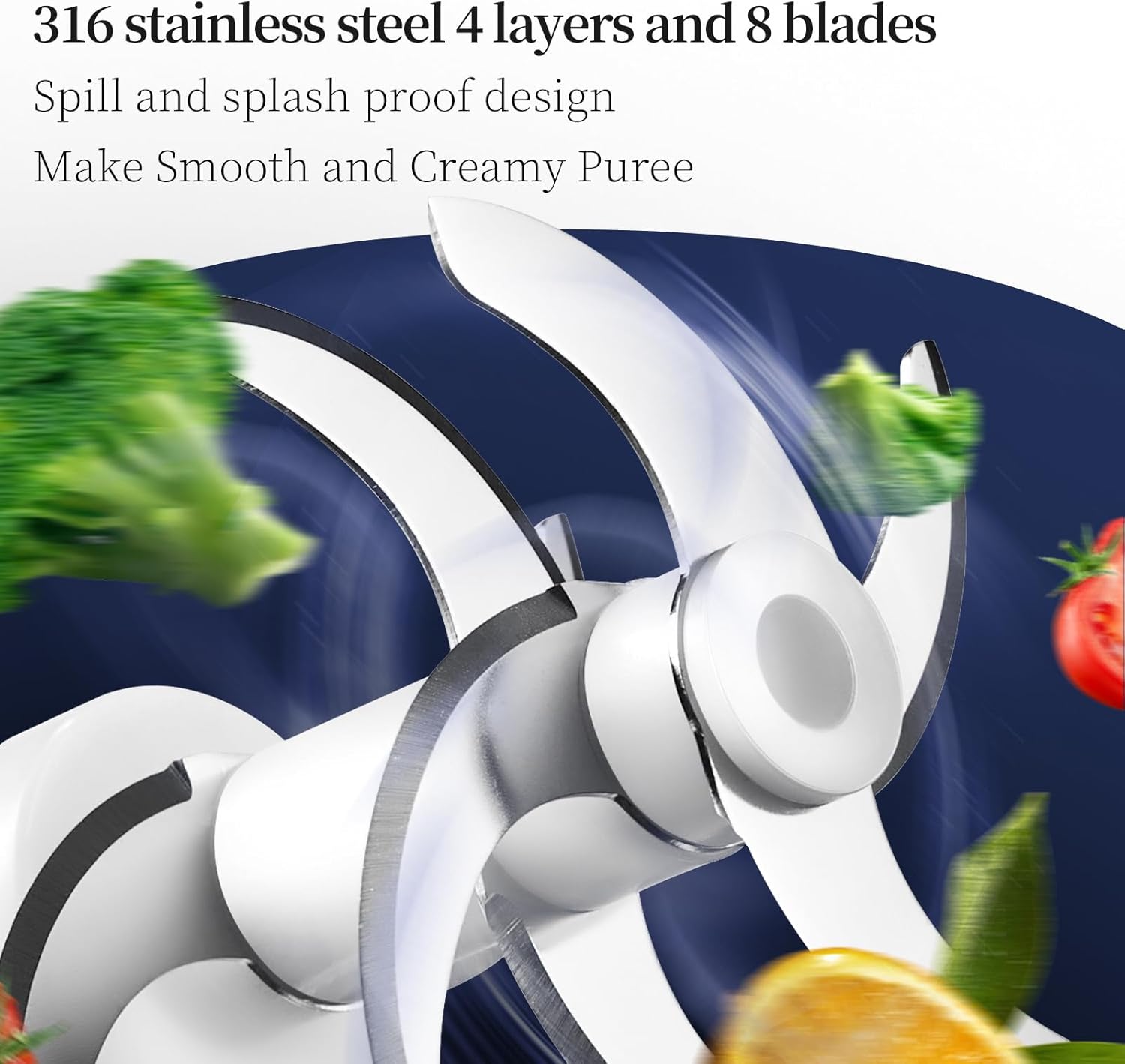 - ăMost Smooth PureeăSpeed 32000RPM/min and equipped with eight "S" sharpened 316 stainless steel blades, makes it easy to create different concentrations of baby foods by stirring food in seconds at the push of a button. With the baby food container, you can store the puree well.