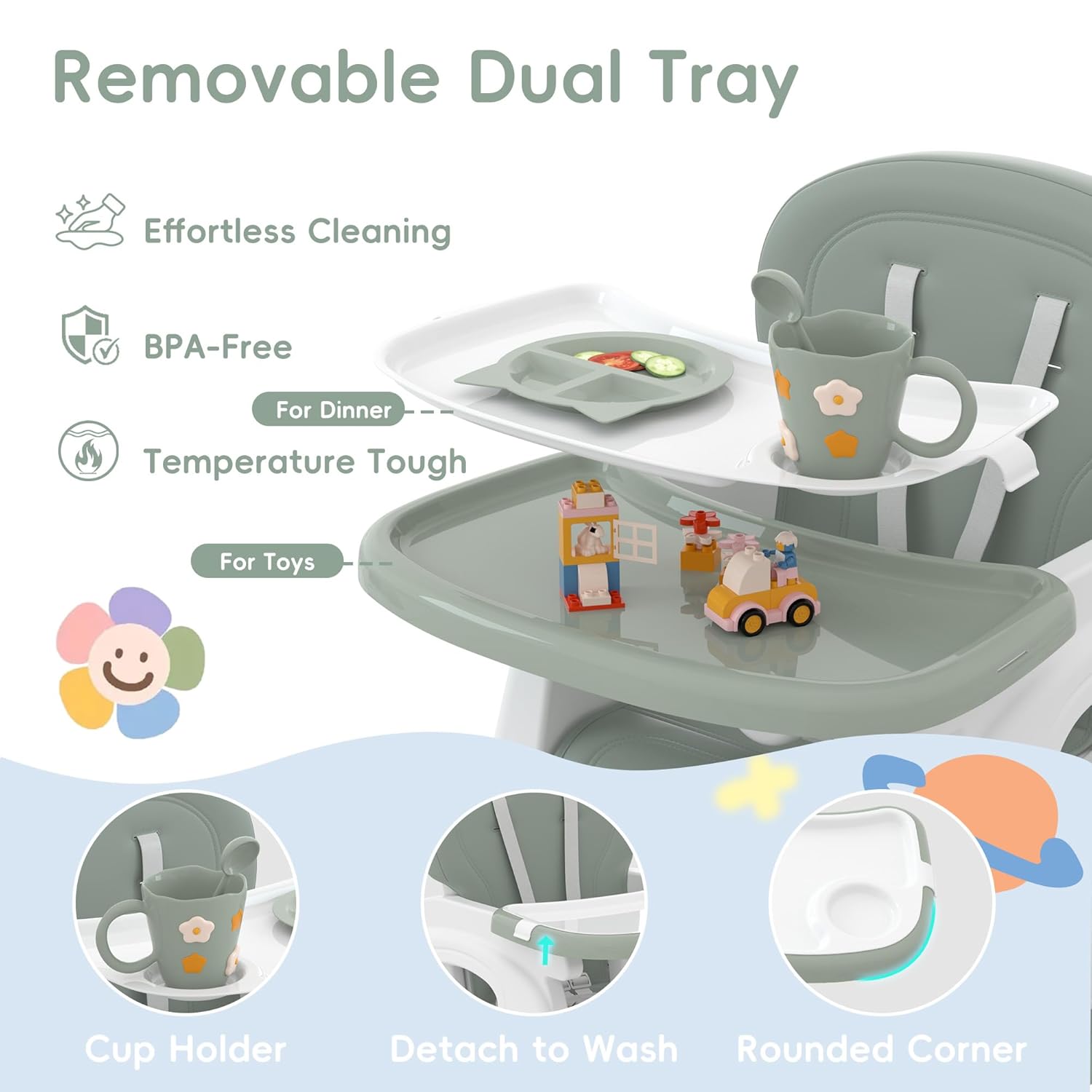 - 🍼 REMOVABLE DUAL TRAY - The baby feeding chair includes a removable double tray, perfect for meals and playtime. The top tray features a built-in cup holder, while the bottom tray provides a spacious play surface. Made from BPA-free PP material, these trays are safe for your child and easy to clean.