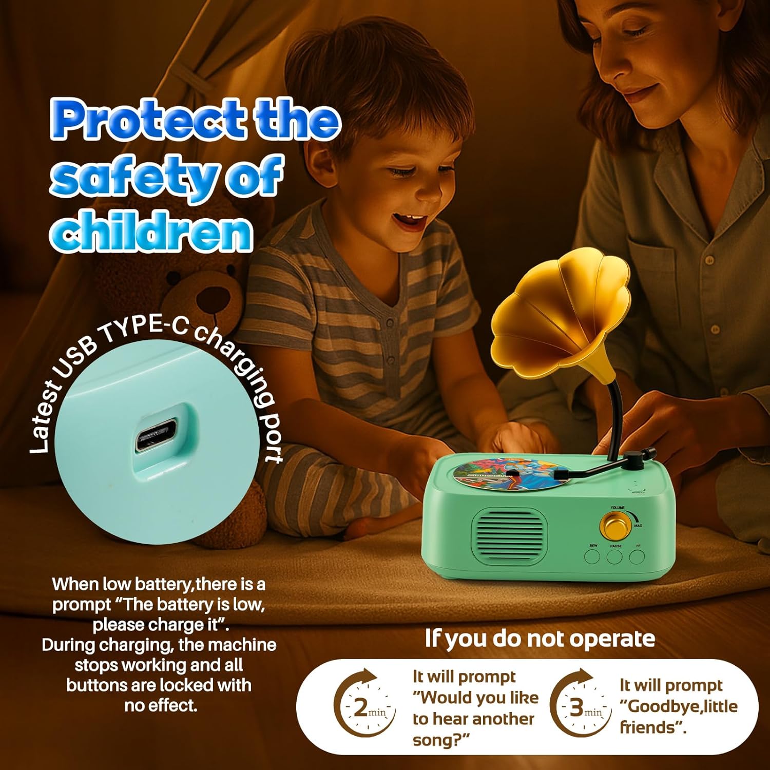 - Cute Design: Phonograph Shape That Is Both Functional And Adorable. Its Unique Design And Vibrant Colors Make It An Attractive Piece Of Art That Children Will Love At First Sight.
