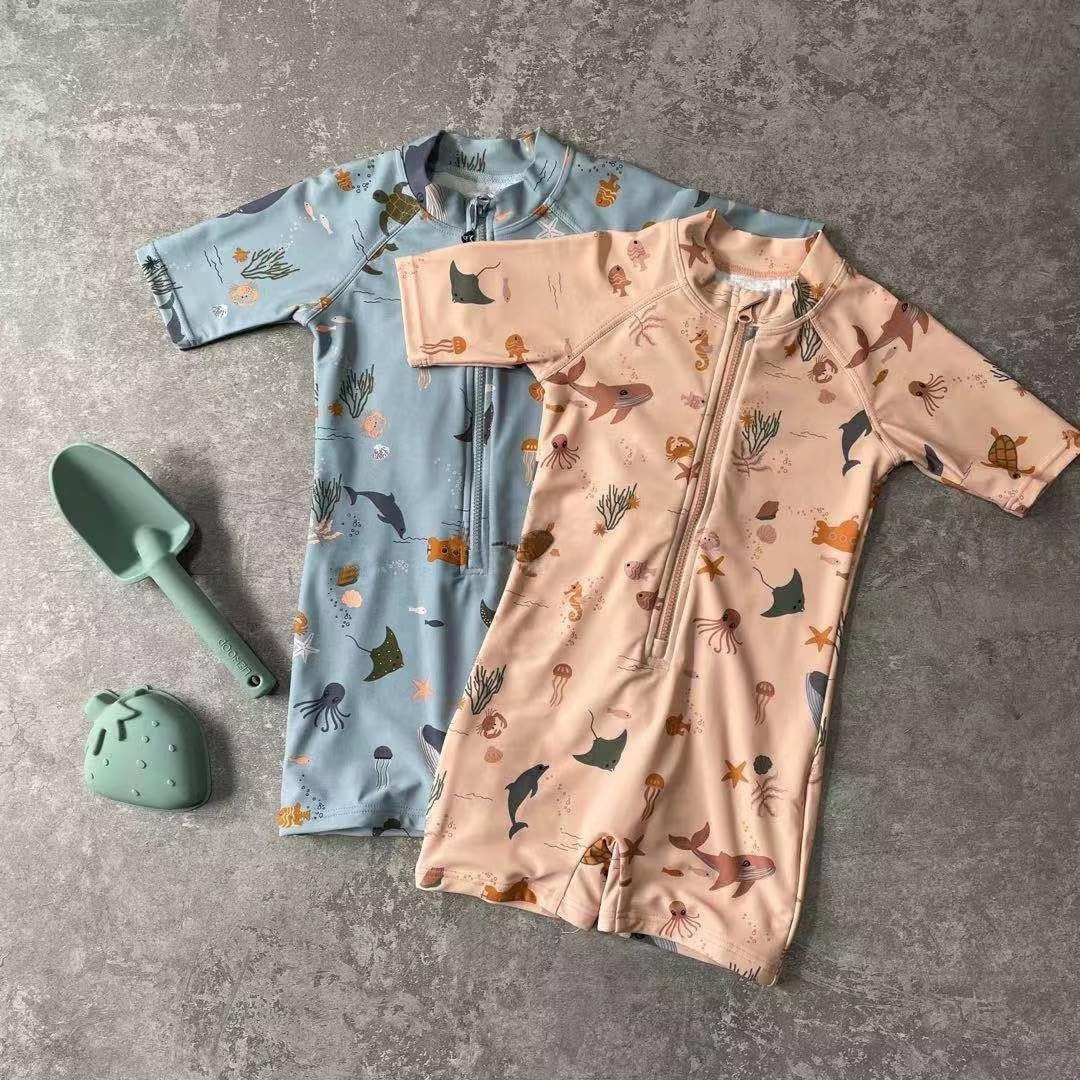 Boys One Piece Swimsuit Whale Dolphin Bathing Suit Zipper Rash Guard Kid Short Sleeve Swimwear Shark Beach Wear UPF50+