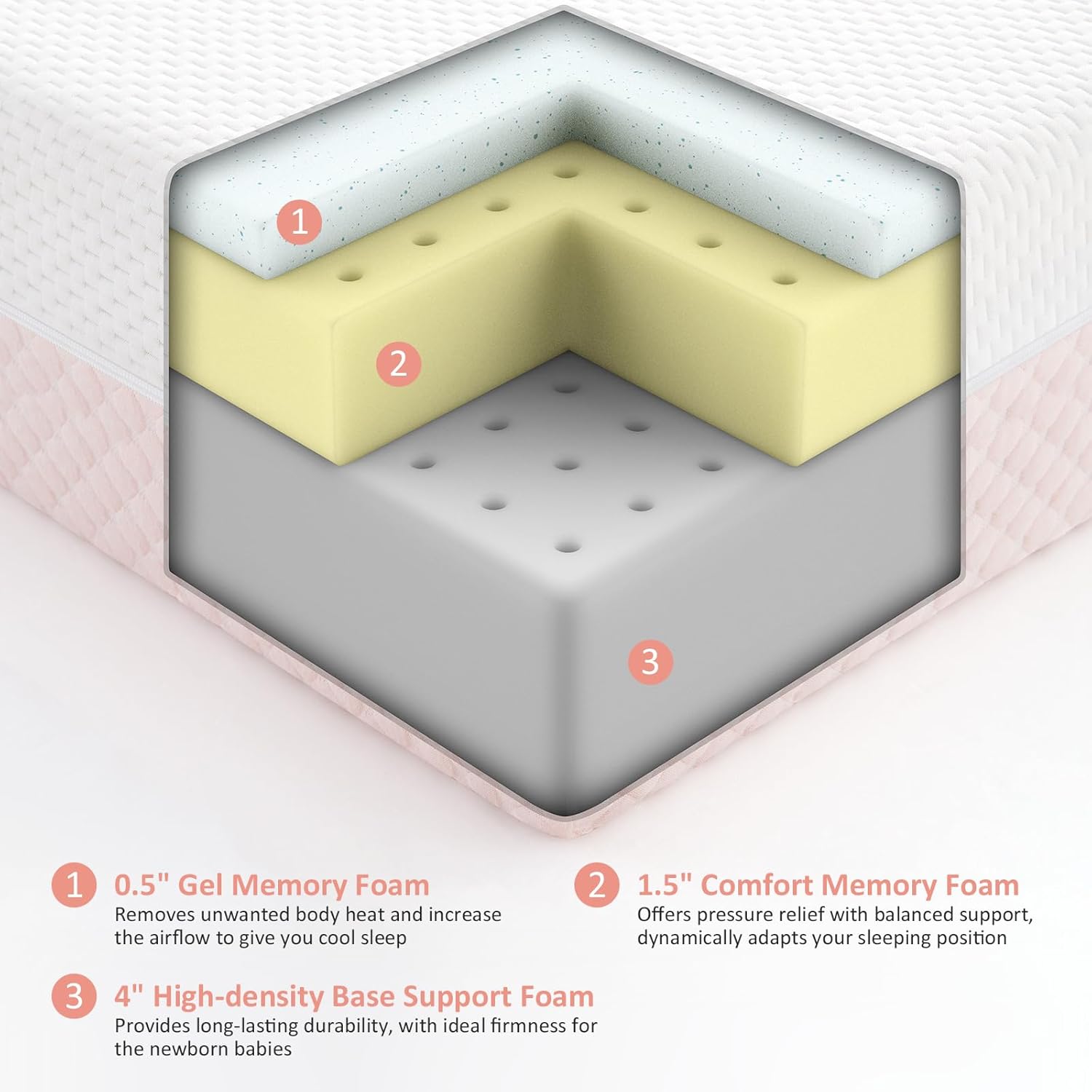Crib Mattress, Dual Sided Comfort Memory Foam Toddler Bed Mattress, Triple-Layer Breathable Premium Baby Mattress for Infant and Toddler w/Removable Outer Cover - White&Pink