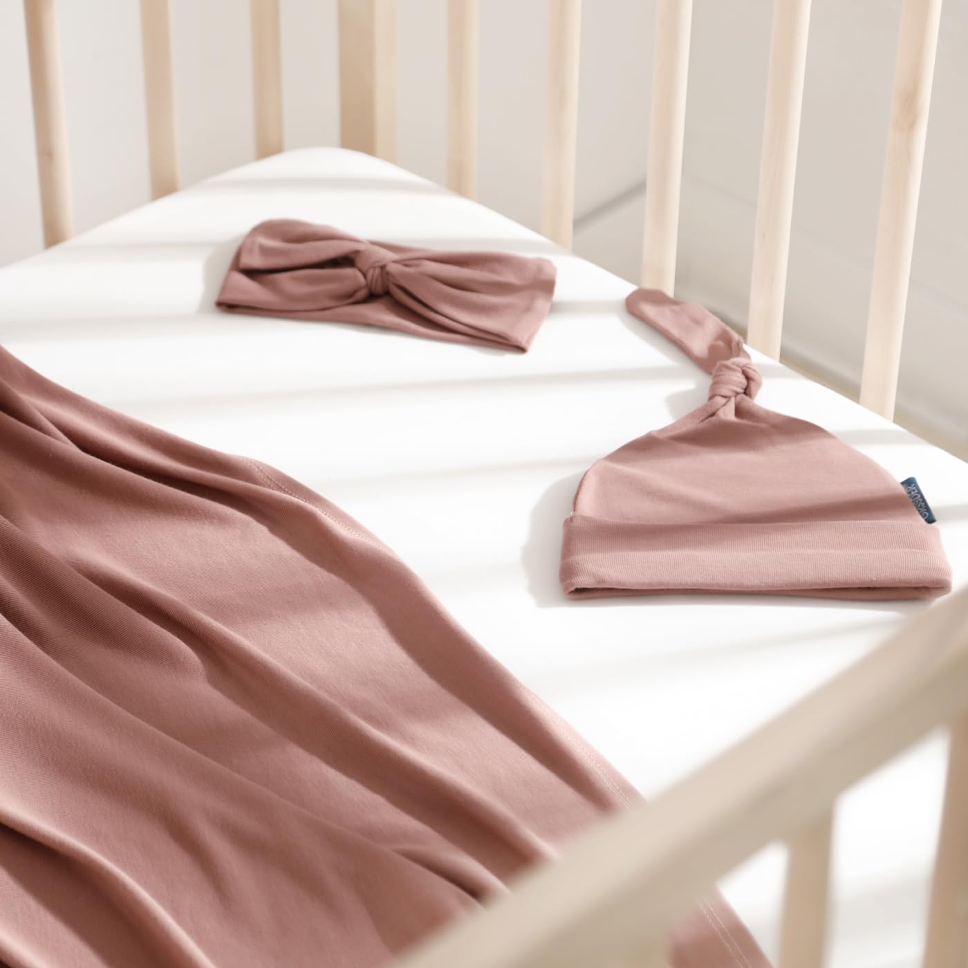 GRSSDER Newborn Swaddle Blanket, Ultra Soft Jersey Receiving Blanket with Matching Headband and Beanie Set 33×44", Stretchy Baby Neutral Swaddle Wrap for Girls and Boys