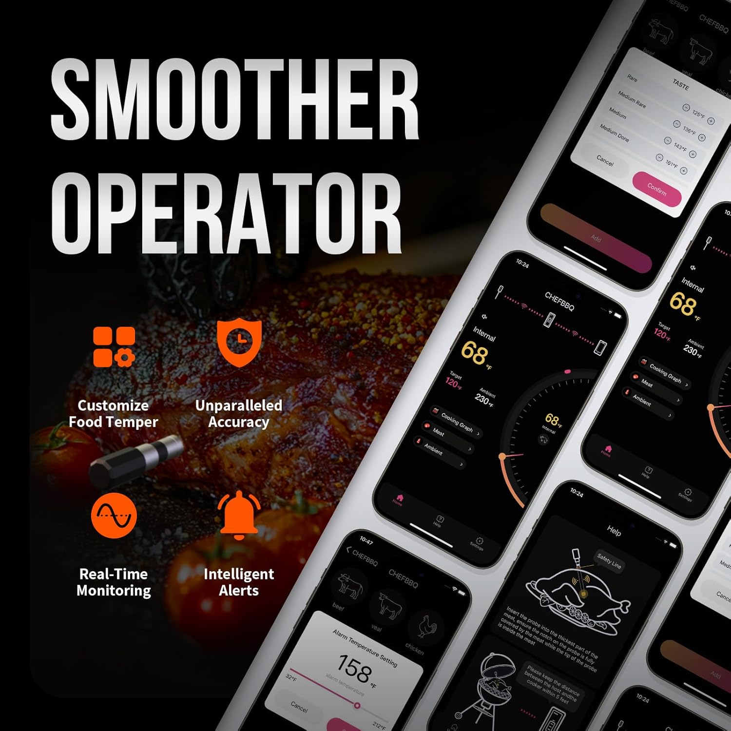 - Instantly Alerts Reminder: You can set and view the cooking temperature on the host with backlit display screen. You can also monitor cooking time, set desired temperature, and receive alerts through the CHEFBBQ APP on your phone