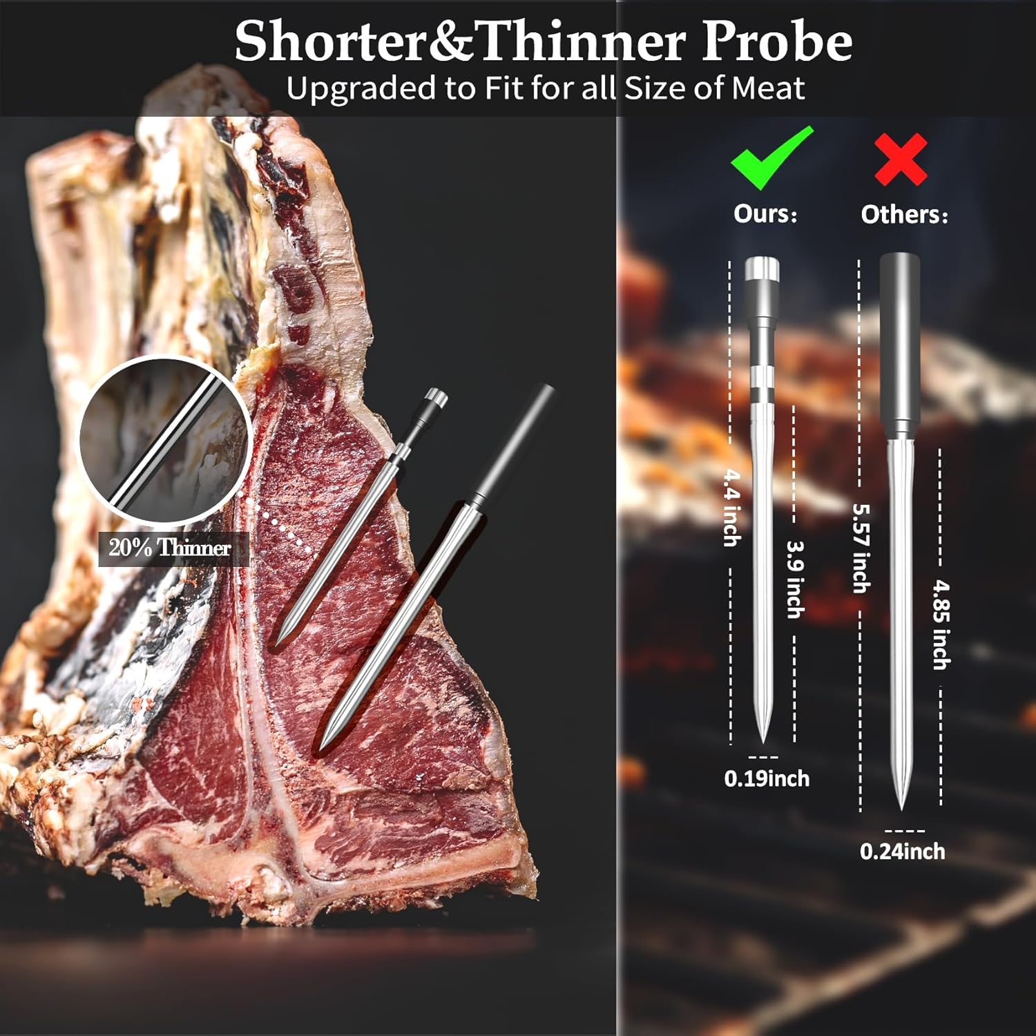 - Thinner, Shorter Dual Probes: The thinner probe design (0.19inch) is suitable for a wider range of applications. Track the internal temperature of two different foods at the same time, or monitor the temperature of both the food and the oven/grill, and keep proteins and juices intact for perfect meat every time. Christmas Gifts