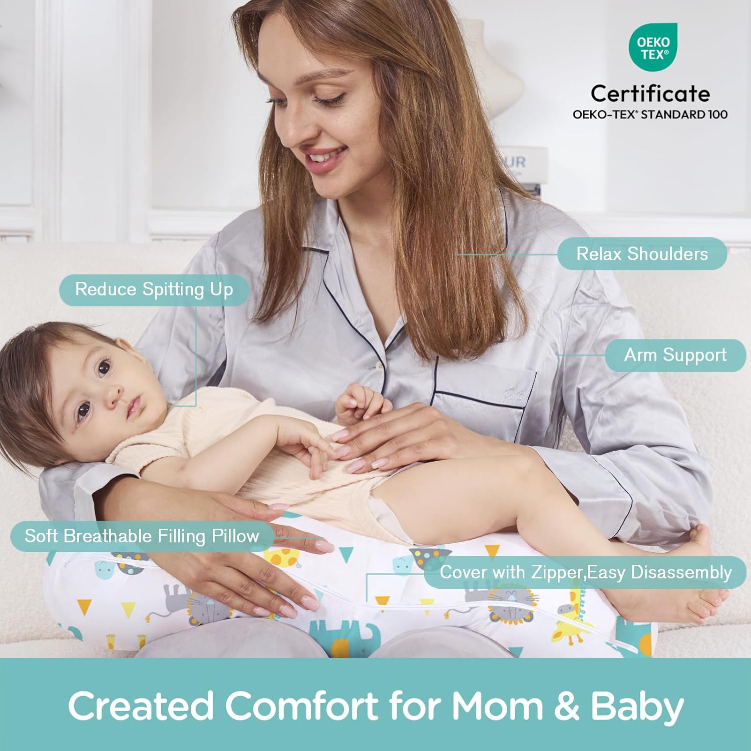 - Fabulous Print & Humanized Design: Specially crafted for baby boys, this pretty nursing pillow for breastfeeding is fabulously printed in different shades of blue, yellow and gray with woodland animals pattern including elephants, giraffes, turtles, etc. Your little one will look much more lovable with our baby pillow for sure! And by lifting babies to a more ergonomic position, this ergonomic pillow can provide great relief for moms from neck pain, back pain and arm pain when in breastfeeding, bottle-feeding and bonding time.