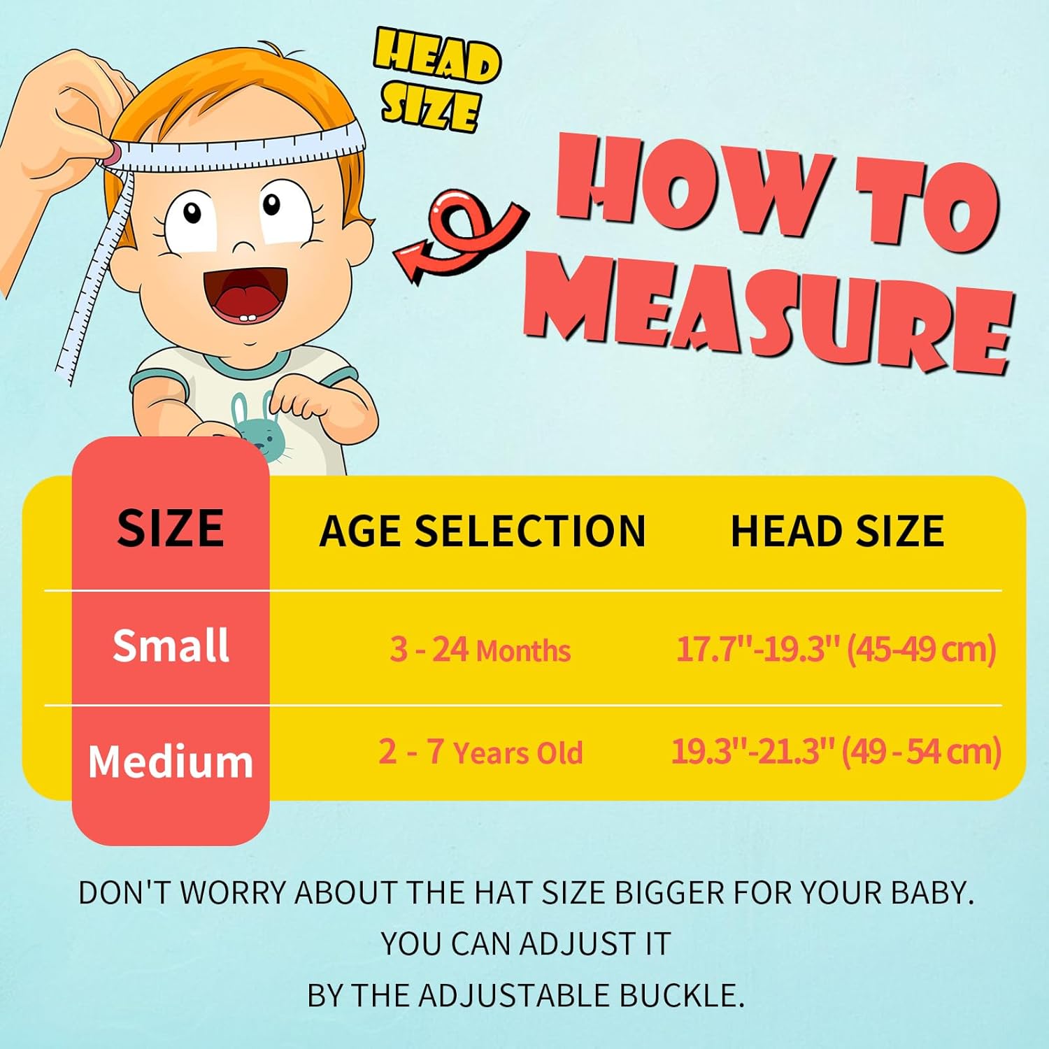 - 【ADJUSTABLE TO GROW WITH KID】Sun hat for kids has two sizes: Size S: 3-24 months fits head circumference 17.7"-19.3"; Size M: 2-7 years fits head circumference 19.3"-21.3". The stretchy headband and rope buckle behind the sunshade hat can adjust the head circumference for a comfort fit. Great for your toddler boy or toddler girl, and big kids too! So, this durable infant hat will definitely grow with your kids for a long time.