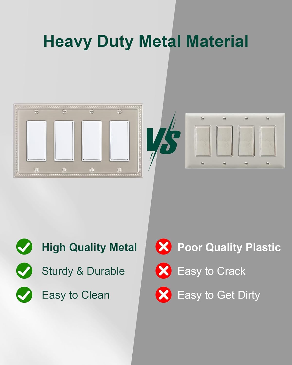 - Durable Metal - Crafted from thick and sturdy metal, this quad decorator outlet cover ensures long-lasting durability and sturdiness. Resistant to tarnishing and corrosion, not easy to break. It will maintain its elegant appearance for years to come.