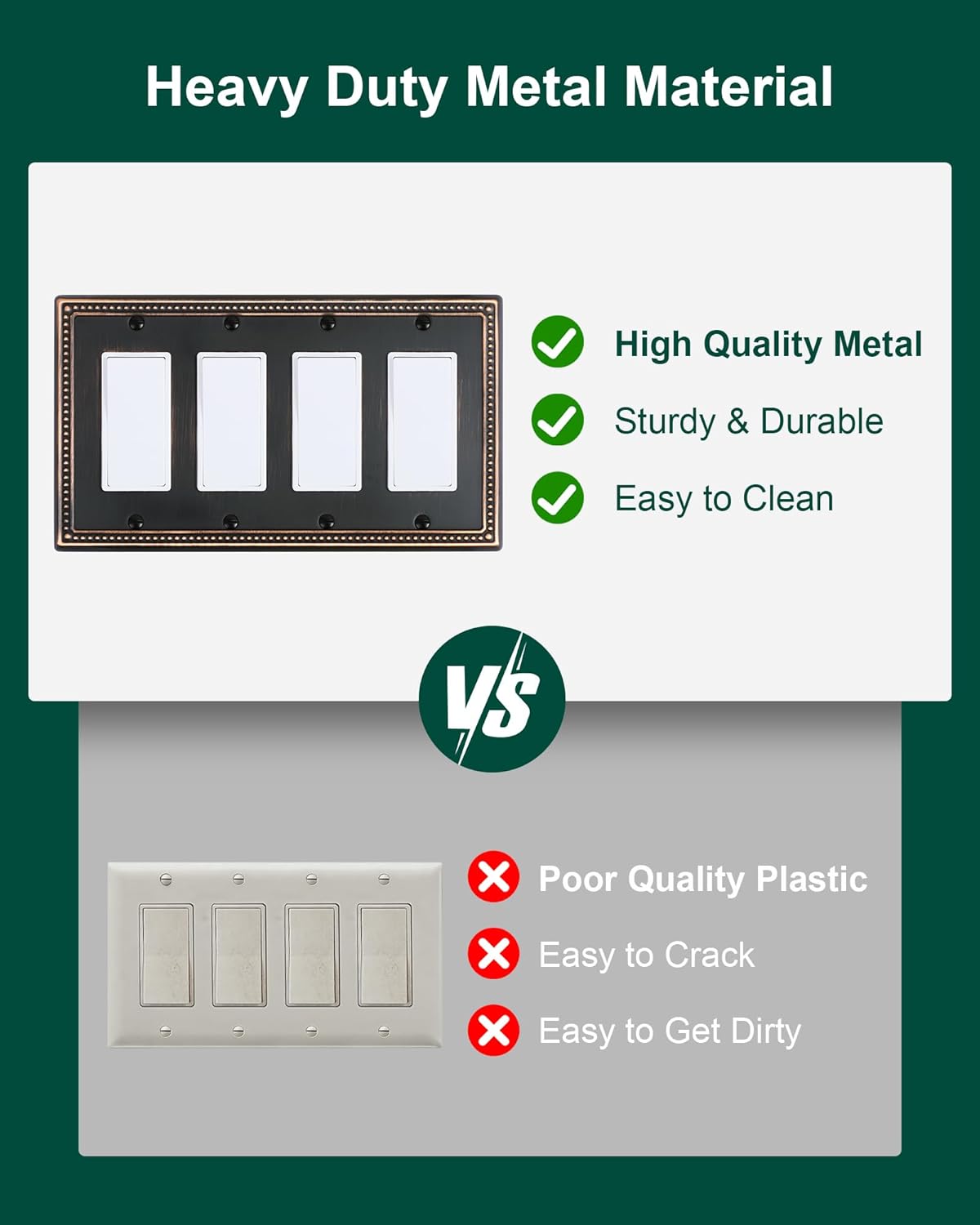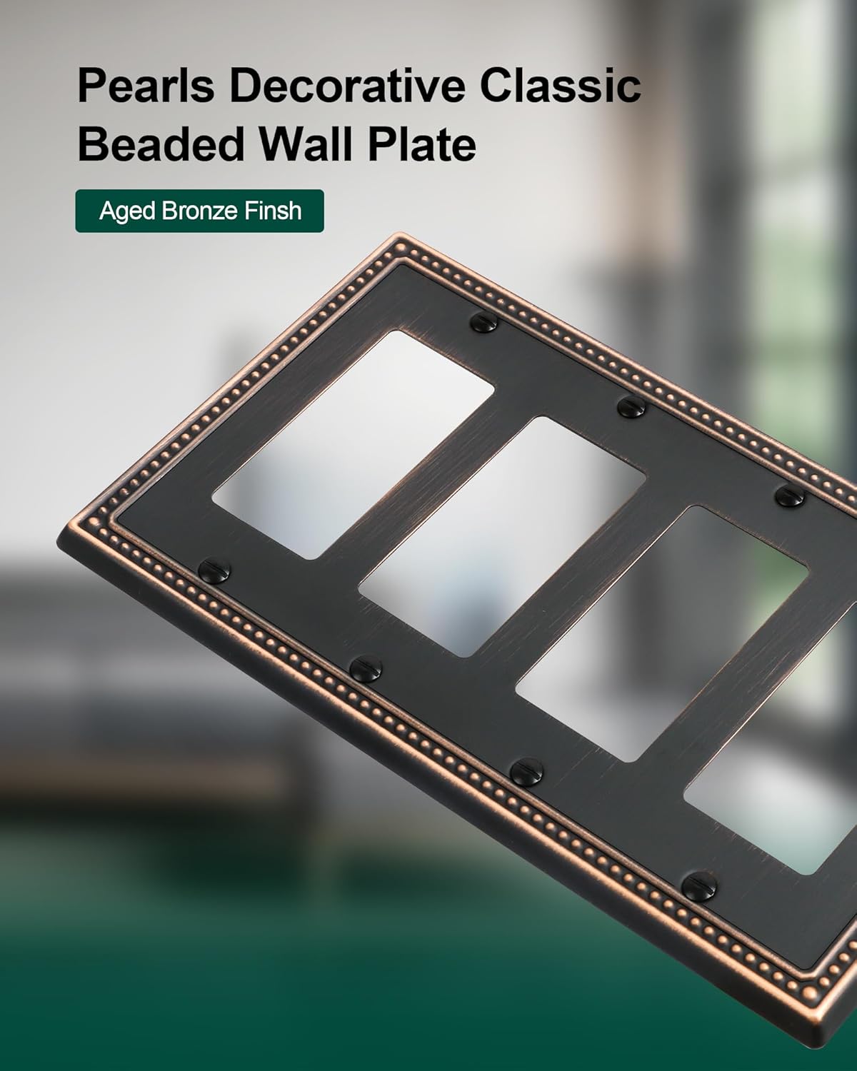 - Timelessly Elegant - The quad decorator outlet covers feature an exquisite aged bronze finish with a traditionally styled beaded border. Offering a functional yet elegant enhancement to your home decor. Stylish wallplate effortlessly blends practicality with a refined decorative accent and sophisticated charm.