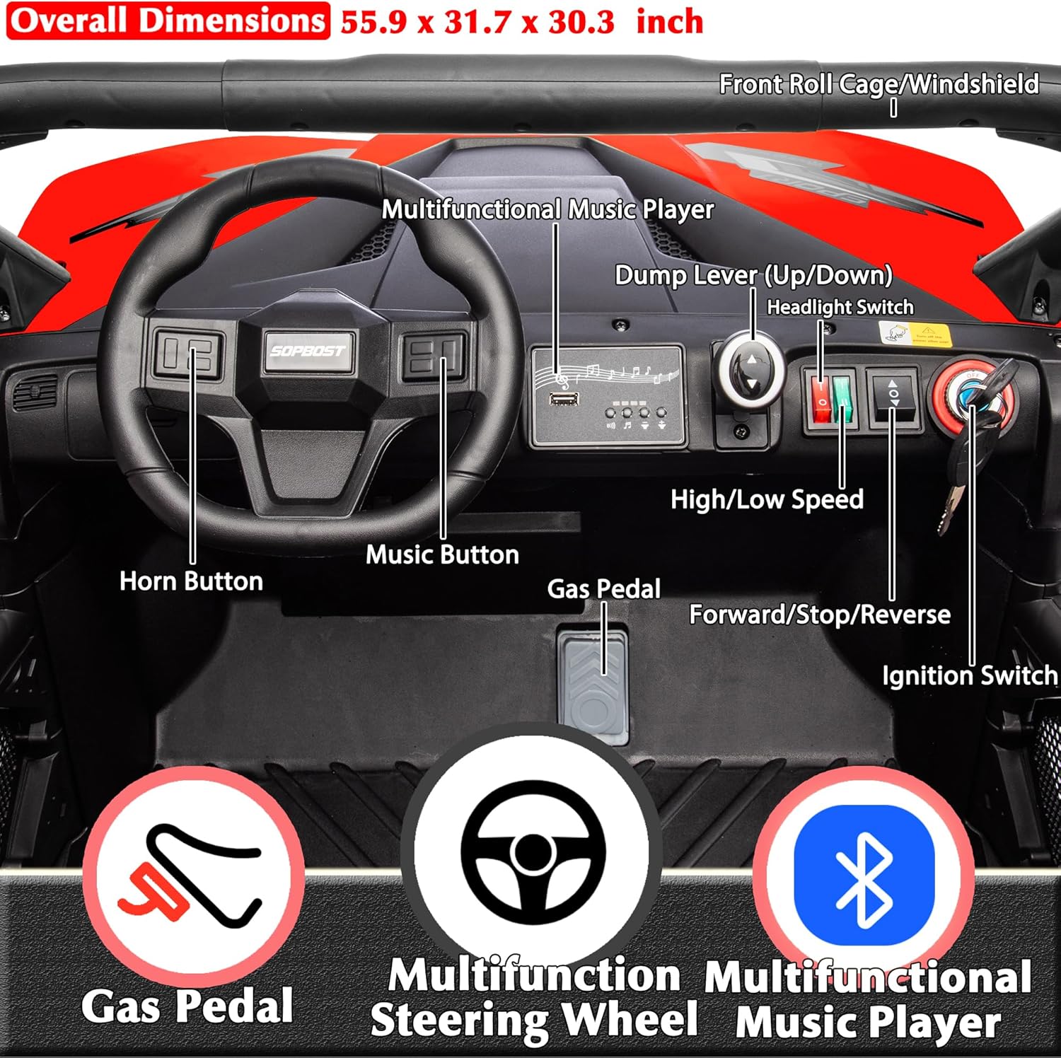 sopbost 24V 10Ah Ride On Toys for Big Kids to Drive 2 Seater Ride On Car with Remote Control Battery Powered Side by Side UTV with Large Dump Bed, 4x75W Motors, Red & Black