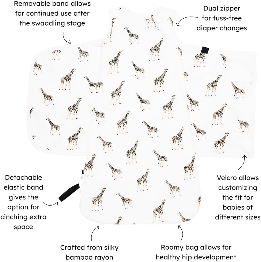 • Fully removable swaddle wrap attached to the sleep bag via Velcro, which allows for different positioning of the swaddle as baby grows.