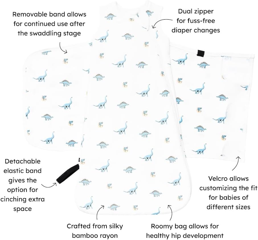 - Fully removable swaddle wrap attached to the sleep bag via Velcro, which allows for different positioning of the swaddle as baby grows.