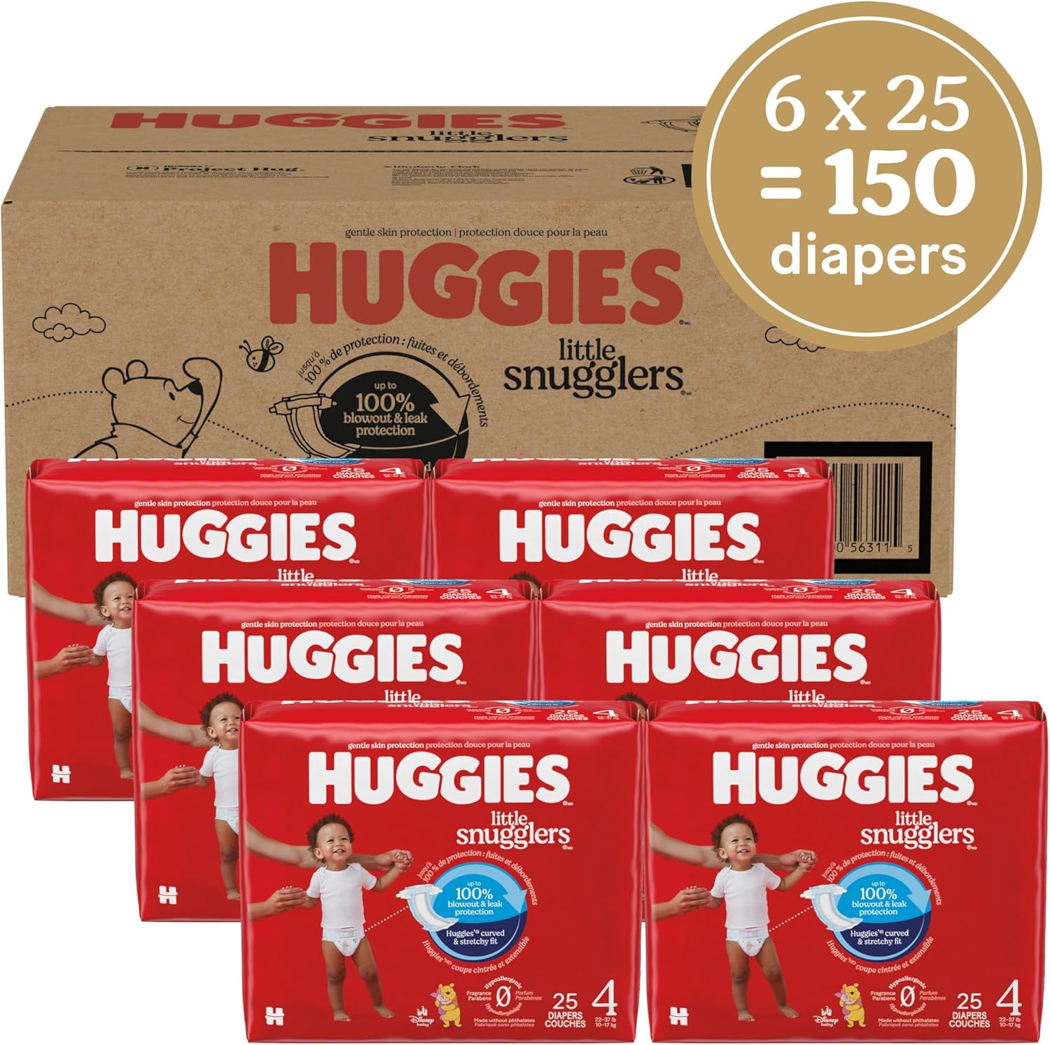 Huggies Size 4 Diapers, Little Snugglers Baby Diapers, Size 4 (22-37 lbs), 150 Count (6 Packs of 25), Packaging May Vary