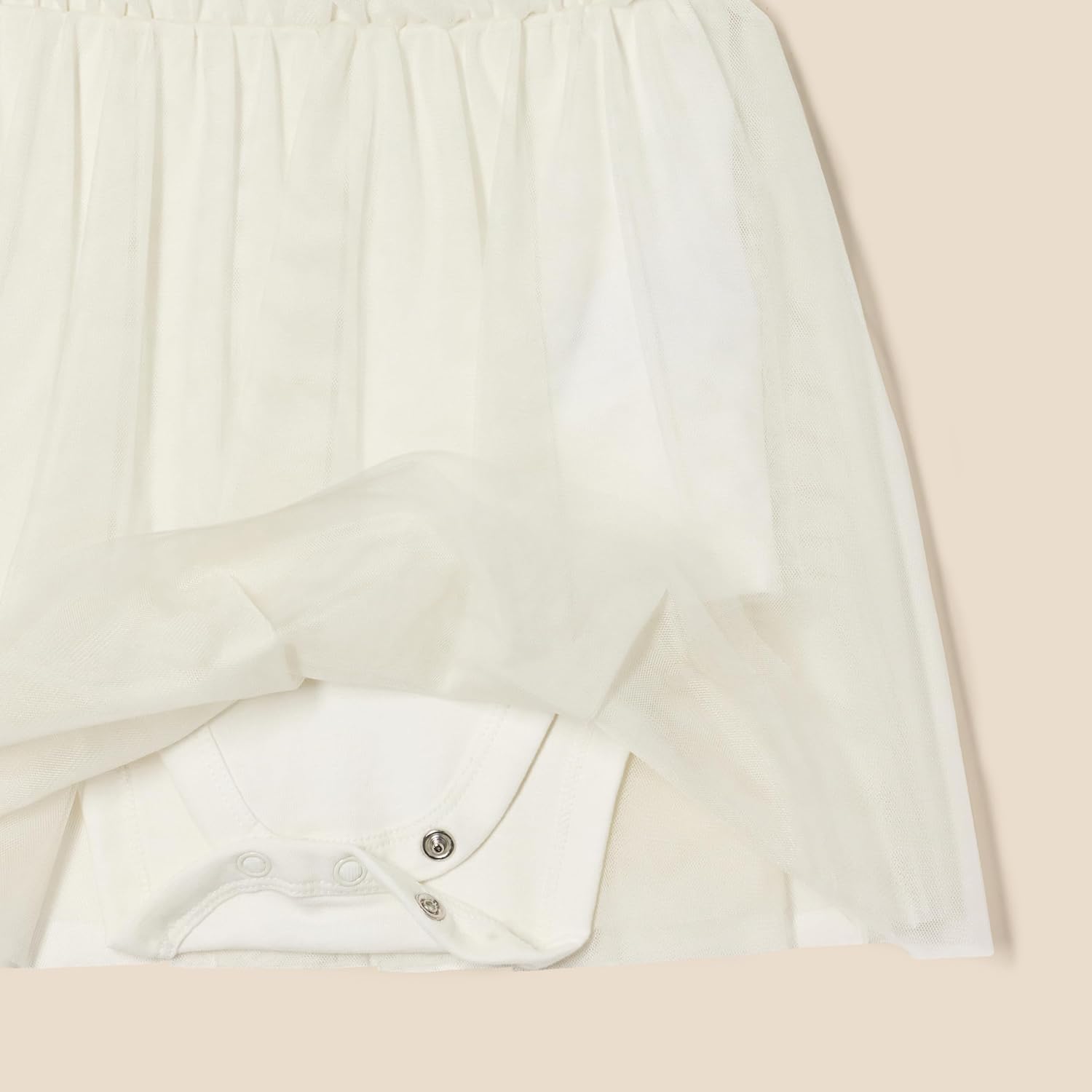 - DETAILS: Puff sleeve knit dress with delicate ruffled tulle overlay. Bodysuit features snaps at base for easy diaper changes.