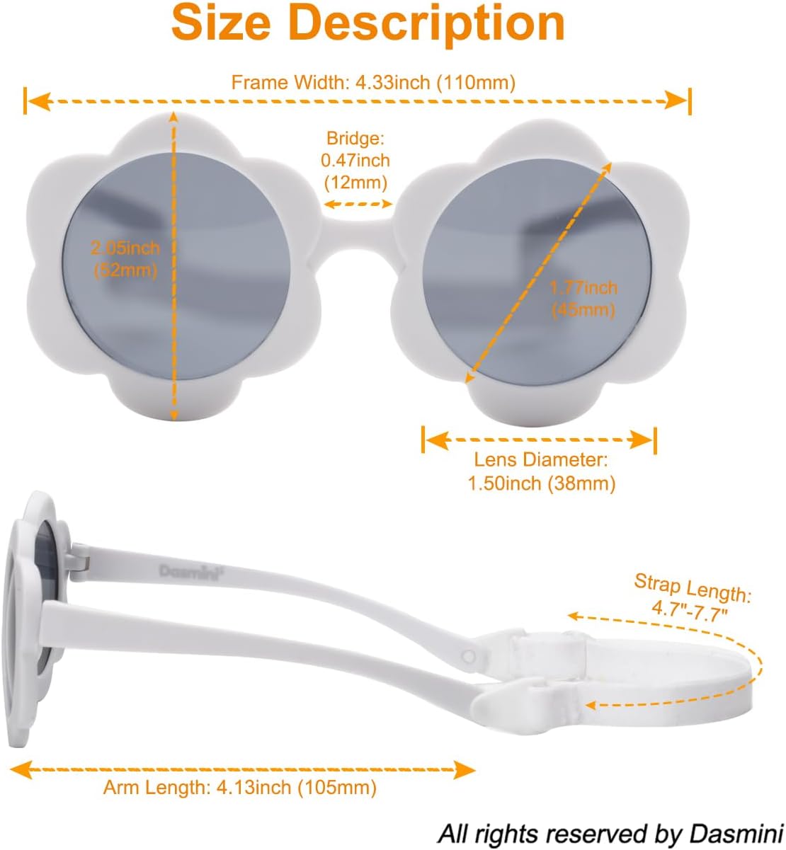 • PREMIUM BABY SUNGLASSES QUALITY:TPEE frame which is flexible and sturdy for baby's safety.Adjustable Attachable Strap securely holds the sunglasses in place.TAC shatter resistant lenses give ultra-protective and our UV400 lenses provide 100% UVA and UVB defense against harmful rays.The Polarized lenses eliminate the amount of reflected light entering the eyes.