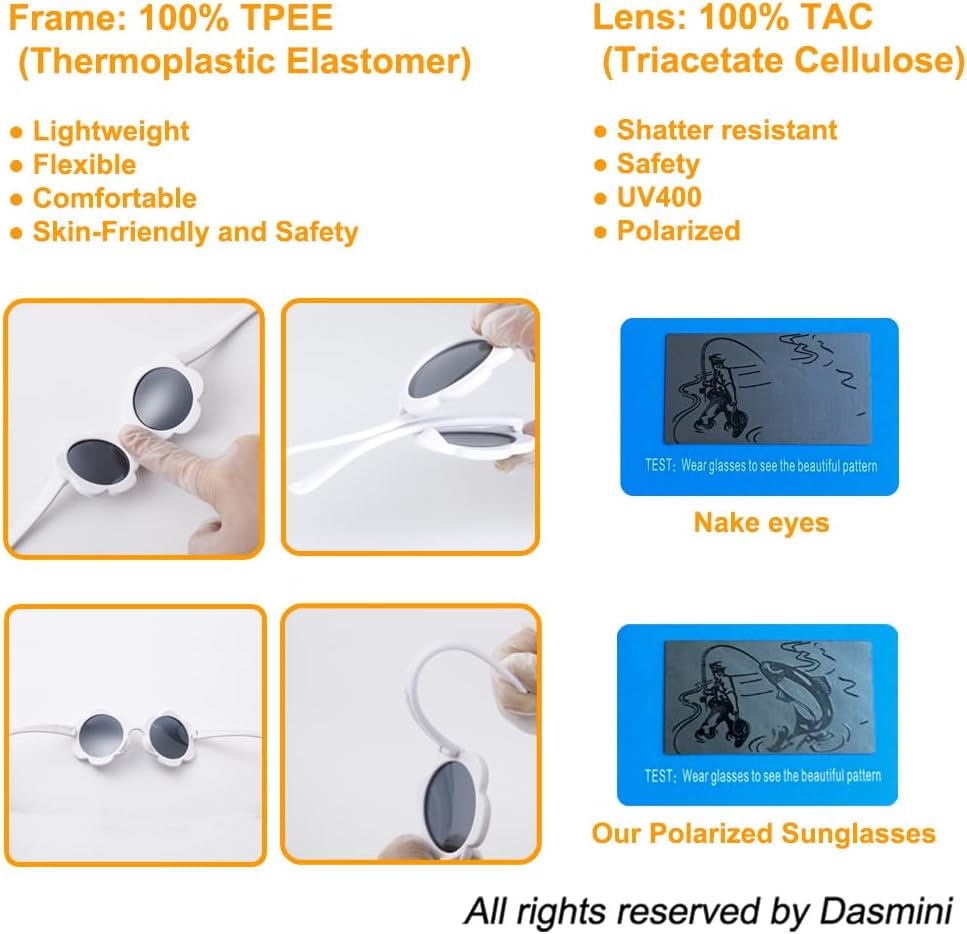 - PREMIUM BABY SUNGLASSES QUALITY:TPEE frame which is flexible and sturdy for baby's safety.Adjustable Attachable Strap securely holds the sunglasses in place.TAC shatter resistant lenses give ultra-protective and our UV400 lenses provide 100% UVA and UVB defense against harmful rays.The Polarized lenses eliminate the amount of reflected light entering the eyes.