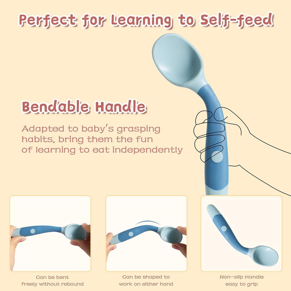- Bendable Handles: Flexible, adjustable handles help babies scoop and easily reach their mouths, perfect to learn self-feeding.