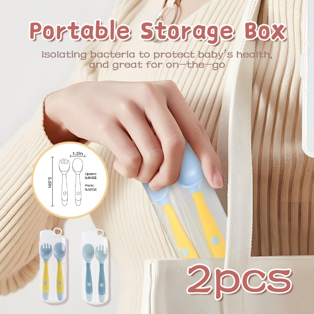 Baby Utensils Spoons and Forks Set Bendable Self-Feeding Silverware for Toddler Children with Travel Case Gum Friendly Food Grade (Yellow+Green, 2 Set)