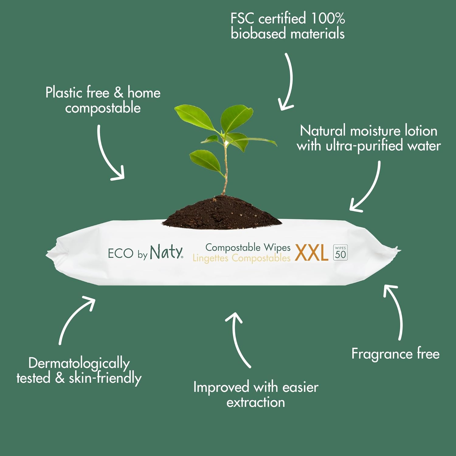 Naty Compostable XXL Baby Wipes - Unscented, 100% Plant-Based, Plastic-Free, Fragrance-Free, Hypoallergenic for sensitive skin and Dermatologically Tested (XXL - 600 Count - 12 Packs of 50)