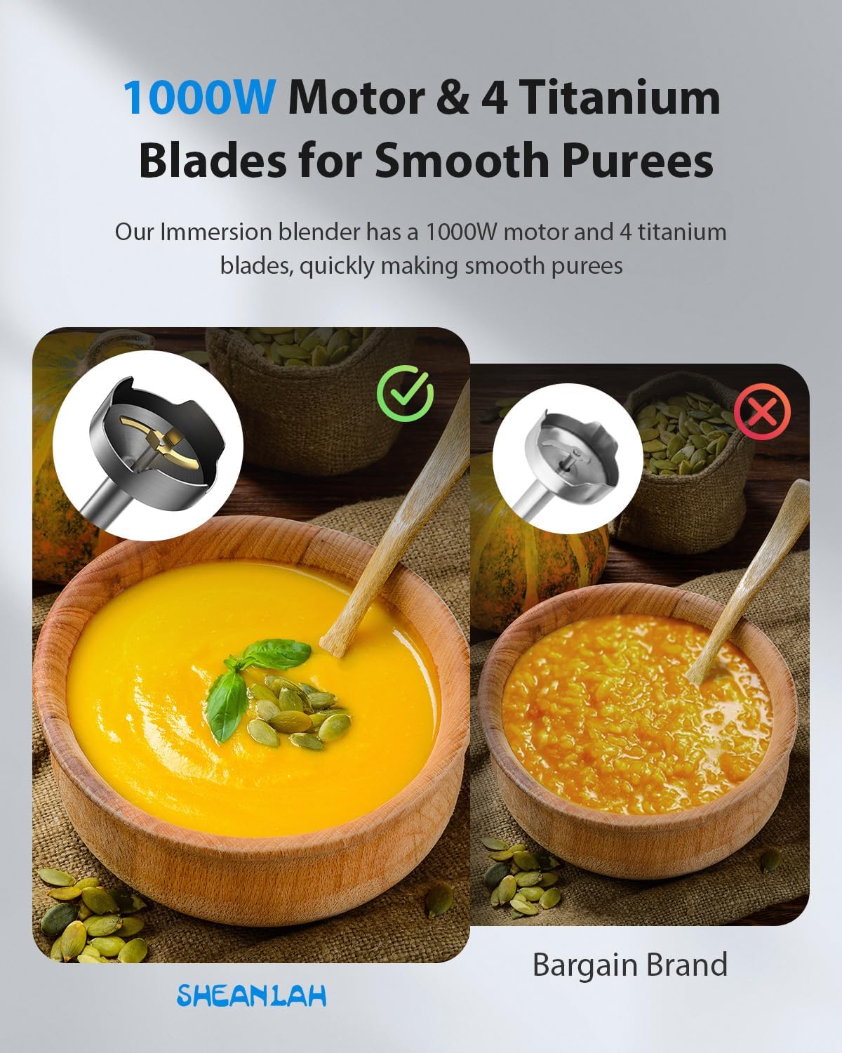 - ă4-Blade Titanium HeadăOur immersion blender features a 4-blade titanium head for superior performance. Compared to standard 2-blade designs, it blends more efficiently, This cutting-edge design not only improves blending efficiency but also extends the lifespan of the blades, making it a reliable choice for all your culinary needs.