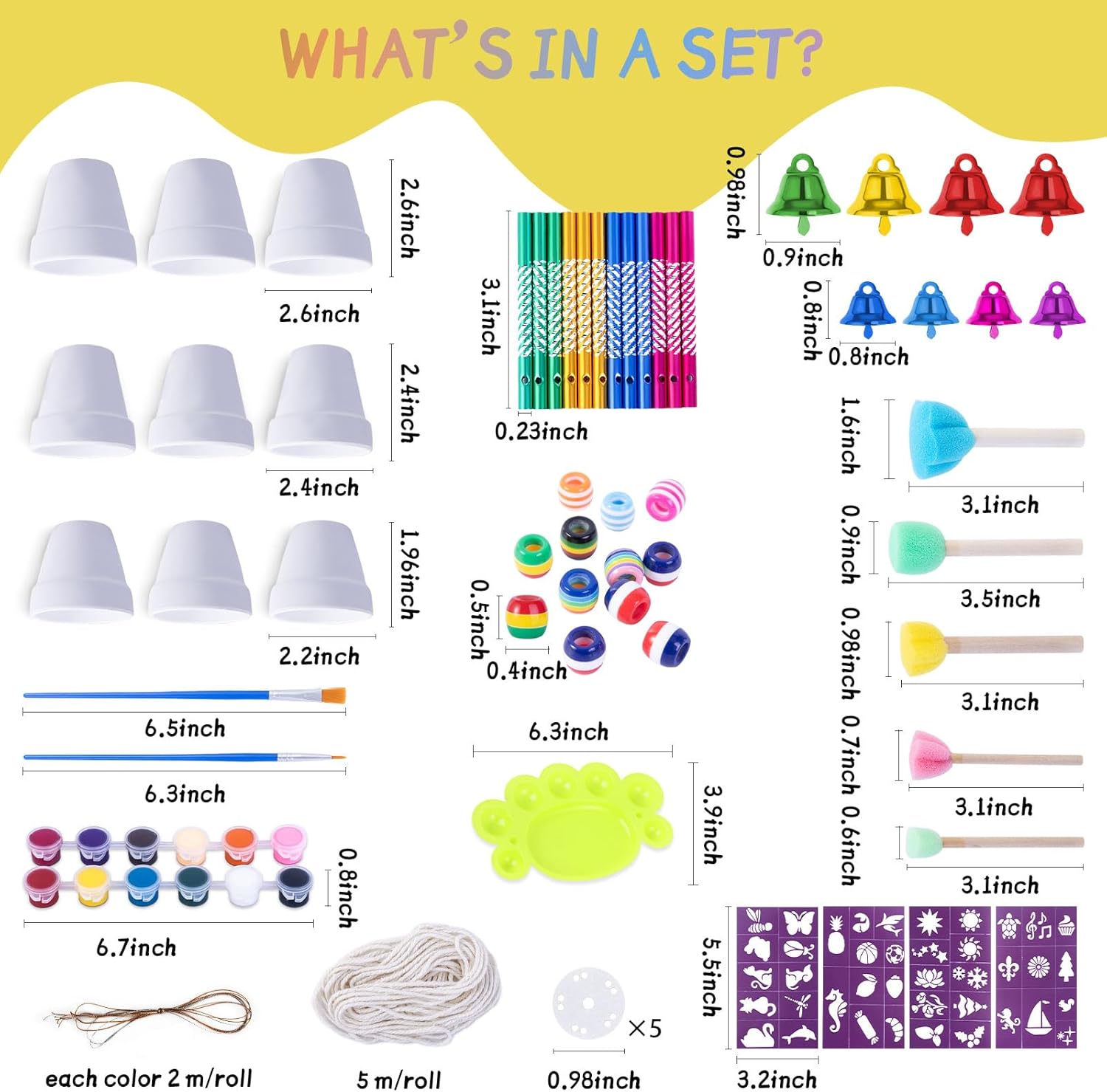 - 【DIY Wind Chime Kits Includes】Our wind chimes for kids includes: 9 big Terra Cotta Pots in 3 sizes, 12 Wind Chime Tubes, 5 Felt pads, 2 rolls cord lines, 12 colors paints, 2 brushes, 45 colored wood beads with holes , 5m cotton cord, 5 sponge stick, 4 stencil,8 color bells ,1 palette,1 instruction manual.Please refer to the product video for detailed operation steps