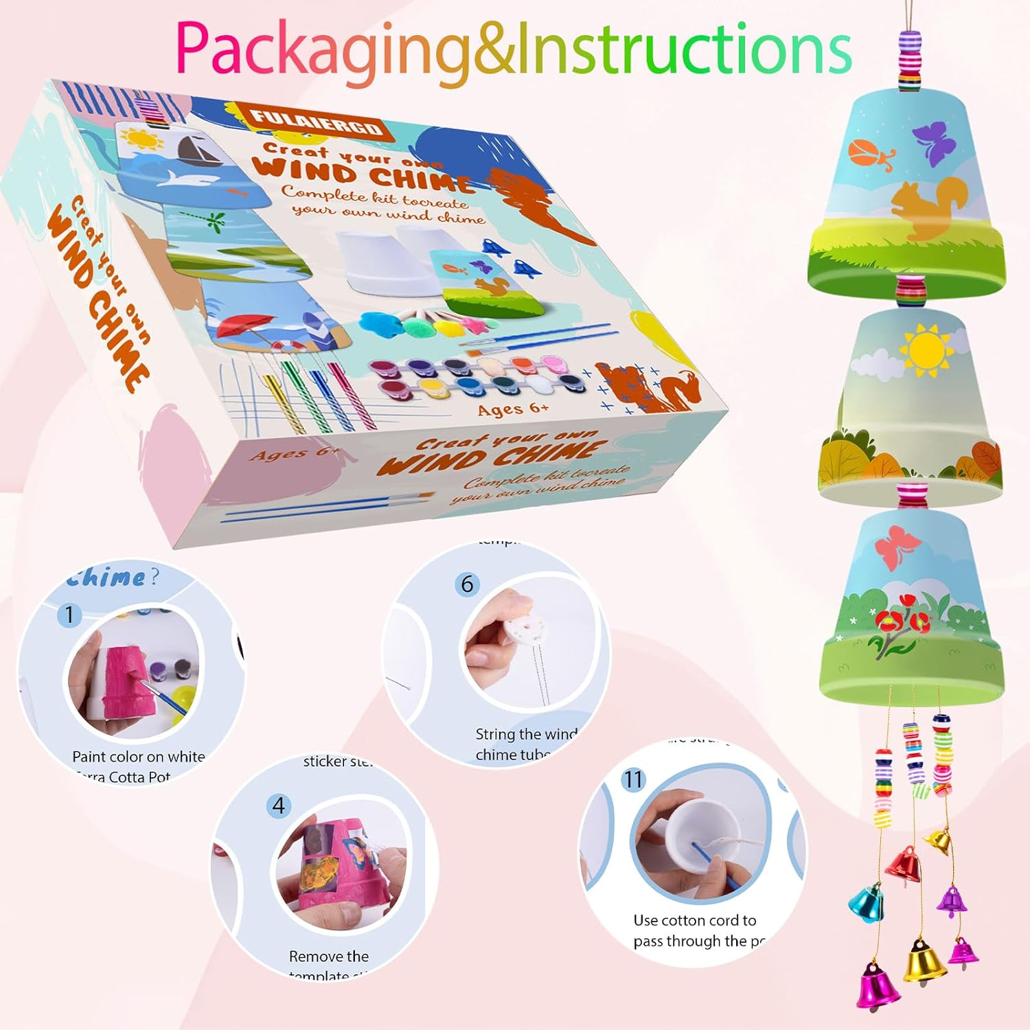 FULAIERGD 3 Pack Wind Chime Making Kit for Kids- Wind Chime Craft Painting Kit-Ceramic Pot, Bells, Stencils and Beads DIY Crafts Gifts for End of Year Student, Christmas, Birthday, Summer Decor