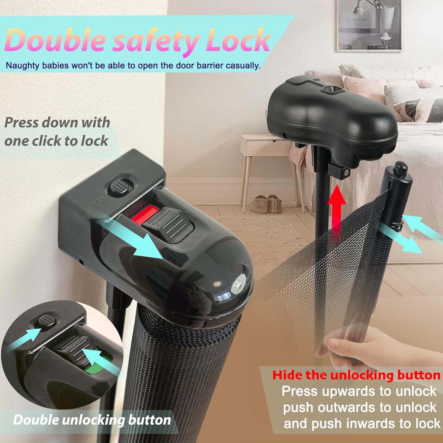 - Safety Double Lock Design - The retractable mesh gate features two locking mechanisms: a mesh lock that controls the mesh's extension and retraction, and a hidden gate lock for opening and closing the gate. Designed for adult convenience, it remains particularly challenging for children, effectively preventing them from opening the gate alone and accessing hazardous areas.