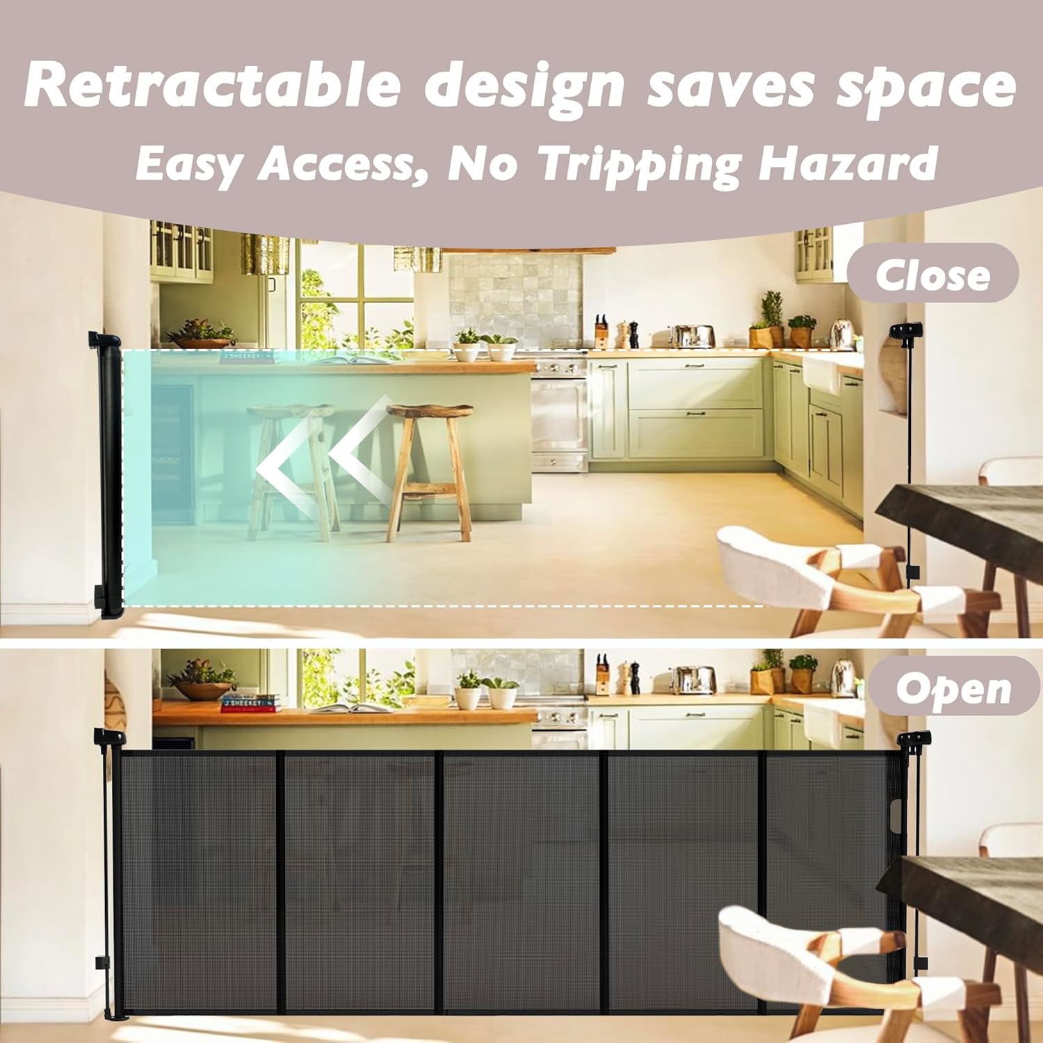 - Suitable for Indoor and Outdoor Use - Our PVC retractable fence mesh is easy to clean, even after outdoor use. Simply wipe it down with a damp cloth or rinse it with water. Ideal for installation at the top or bottom of stairs, in kitchens, near doors, on terraces, in corridors, gardens, and more—suitable for both indoor and outdoor use.