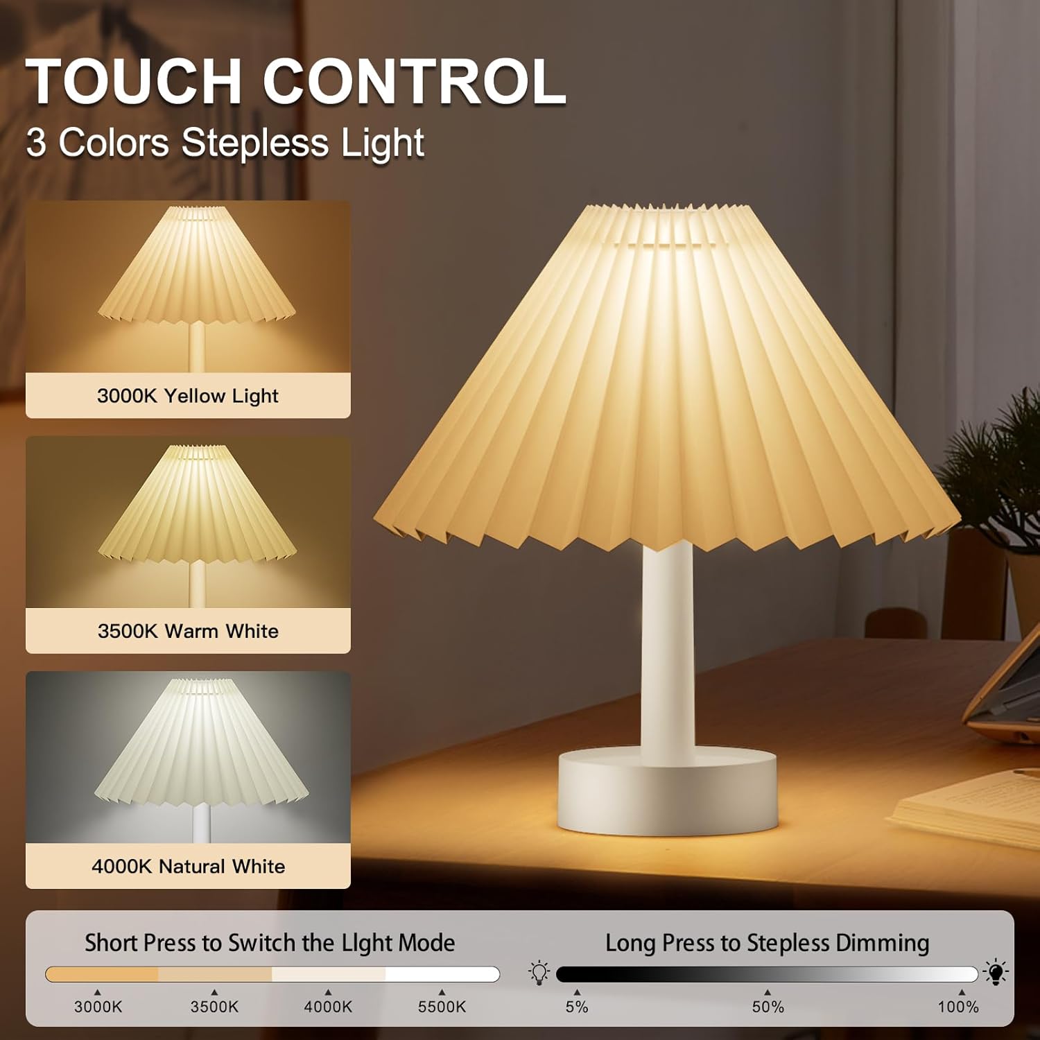 - 【Multiple Mode Functions】3 light modes + stepless dimming。First press is yellow light, second press is white light, third press is warm white light,Long press button any kind of light can be adjusted light brightness, light has memory function.