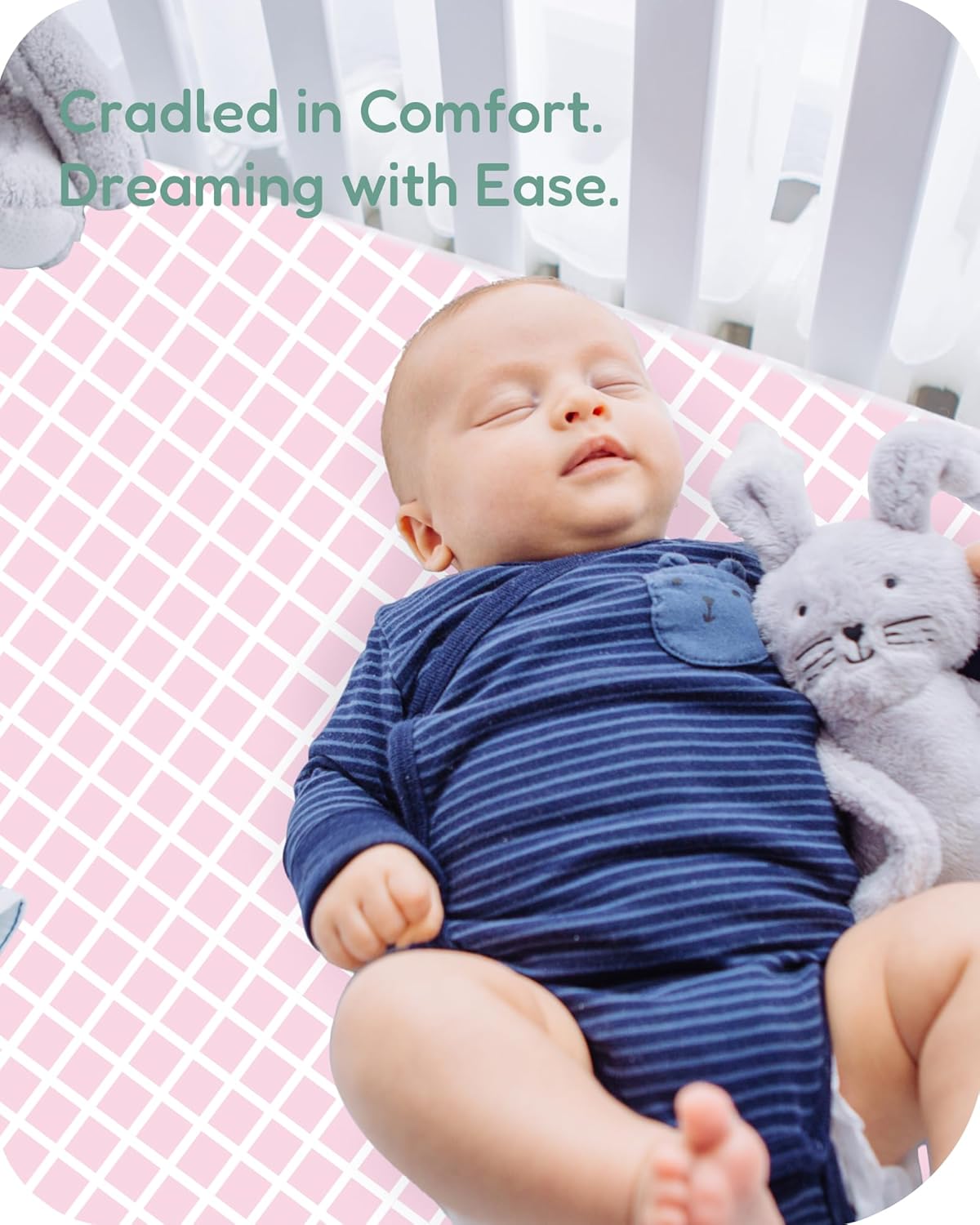 - Premium Softness & Comfort: Crafted from high-quality polyester, these mini crib sheets fitted are buttery soft, breathable, and temperature-regulating, keeping your baby cozy throughout every season. The gentle stretch ensures a snug fit, while the fabric remains airy yet warm for all-day comfort.