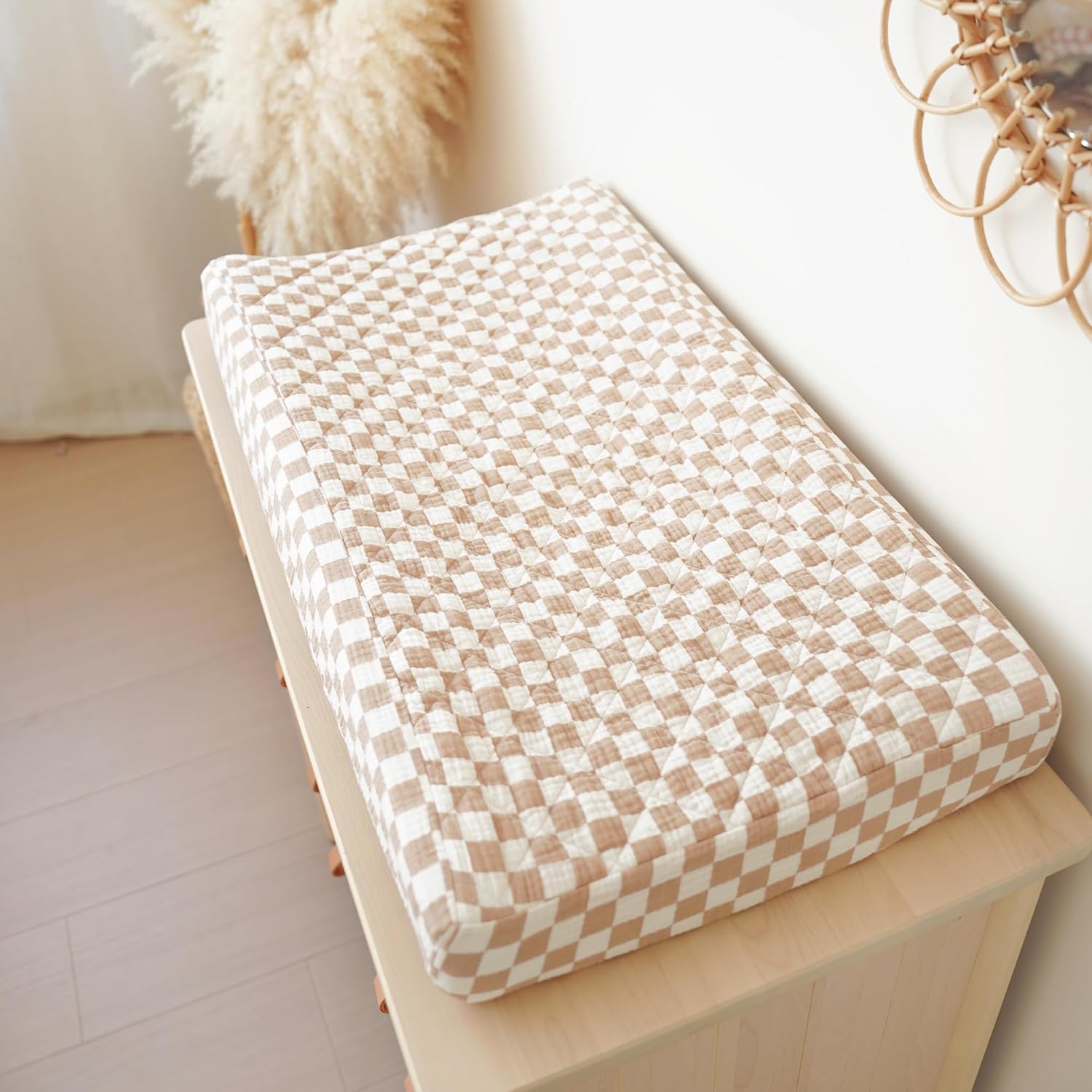Konssy Waterproof Muslin Changing Pad Cover 2 Pack, Quilted Cotton Fitted Diaper Changing Table Cover, Soft Changing Pad Sheets for Girls Boys (Coffee Check,Moon)