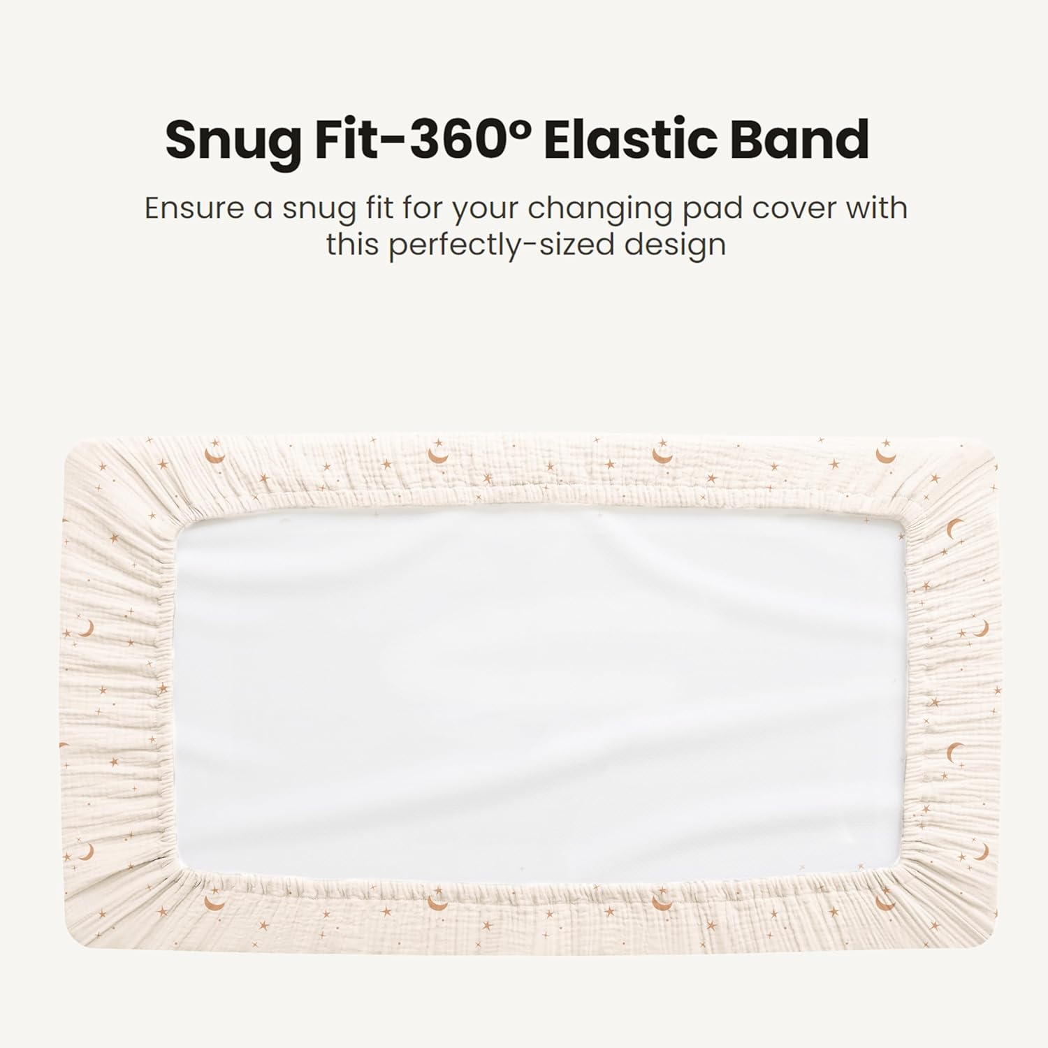 - Snug Fit: Our muslin changing pad cover measures 32” x 16”and features a fully encased 360-degree elastic. This design ensures a snug and secure fit on your changing pad. Say goodbye to slipping covers during diaper changes!