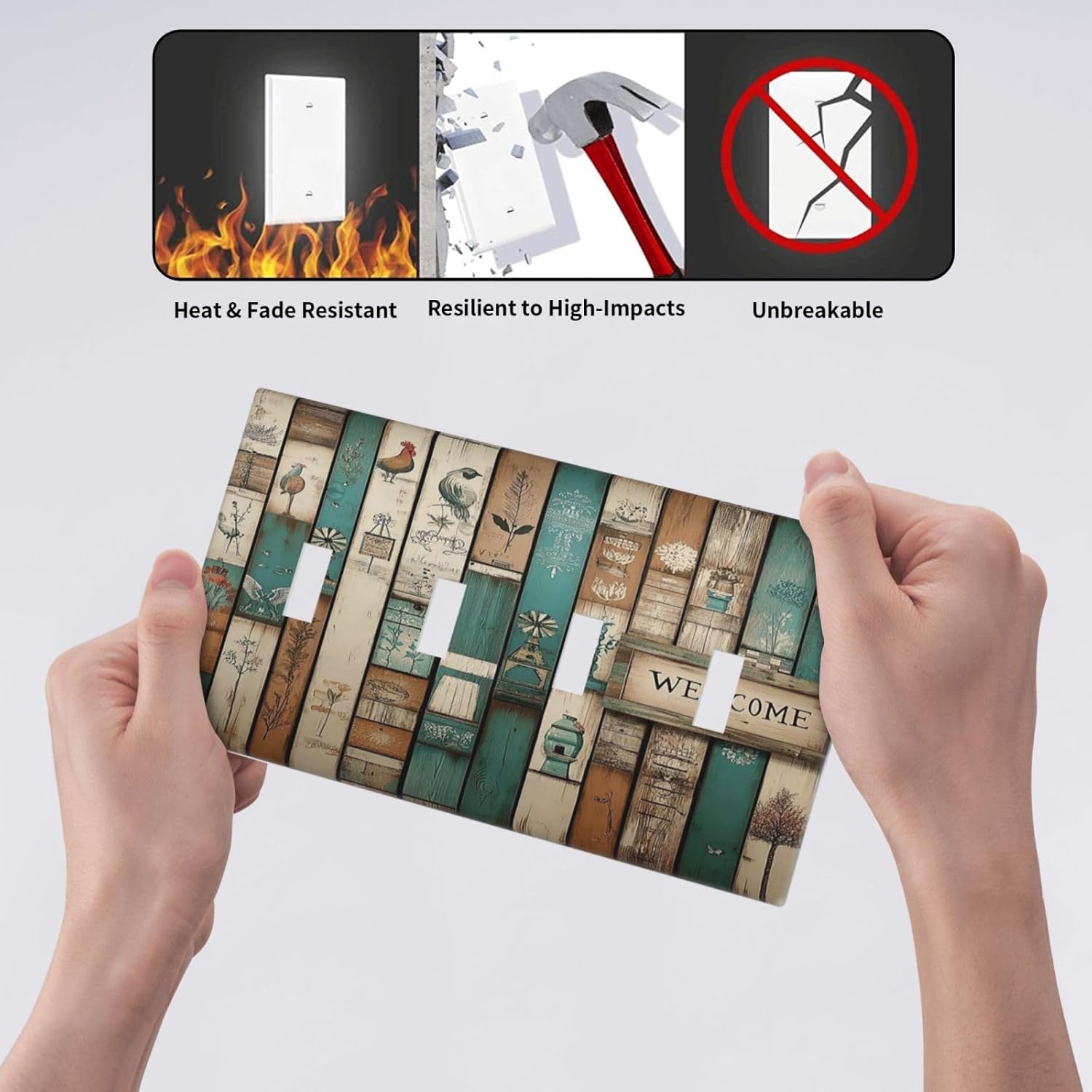 Light Switch Covers Vintage Wood Brown Turquoise Splicing Quad Toggle Electrical Faceplate 4 Gang Wall Plate Decorative Switch Plates For Farmhouse Cabin Decor