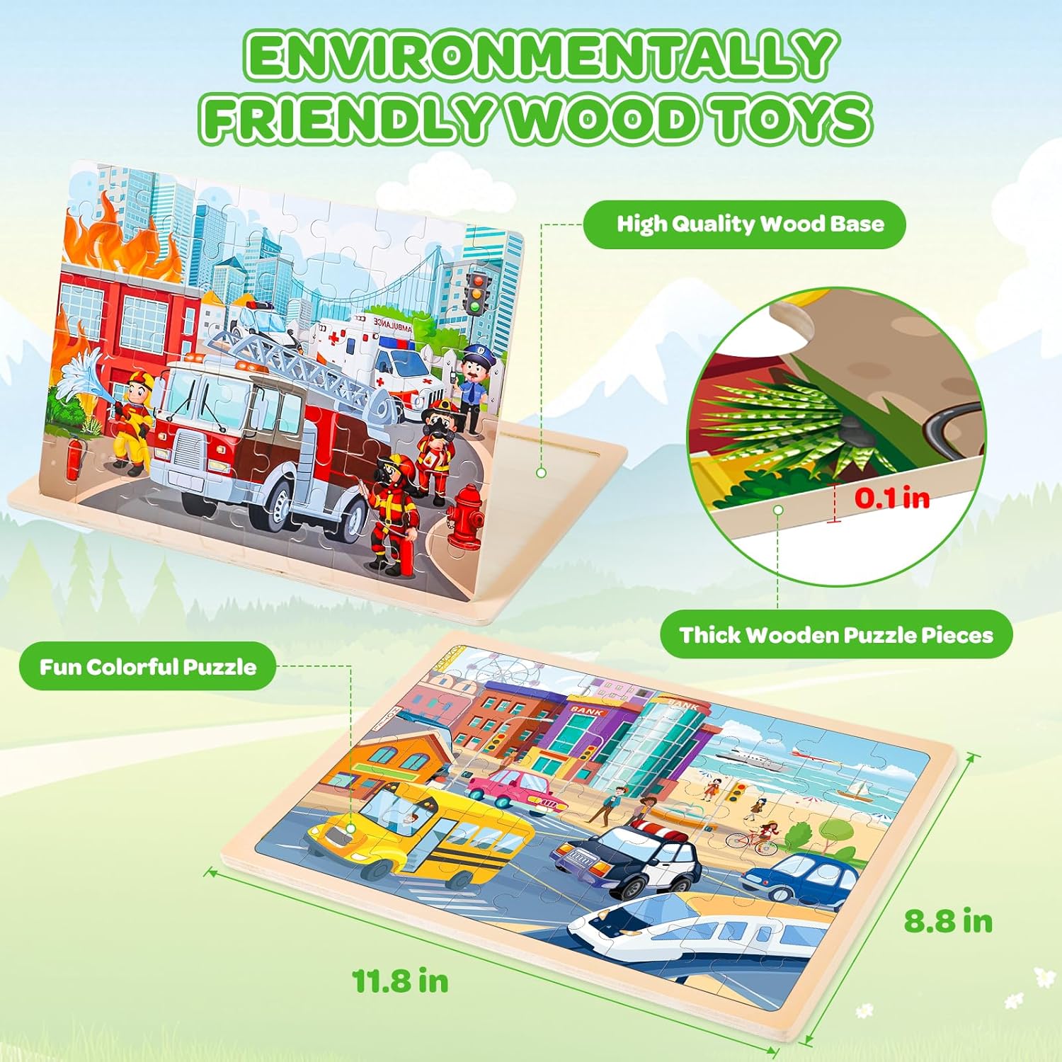 - Vehicles Toddler Puzzles - 6 pack 60pcs wooden Geography jigsaw puzzles for kids ages 3-5 years old. The wooden toys include Marine vehicles, Road vehicles, Fire and medical vehicles, Farm vehicles, Garbage trucks, and Engineering vehicles. Easy, funny, wonderful- educational Shape Puzzles toys develop hand-eye coordination, fine motor skills, and creative thinking.
