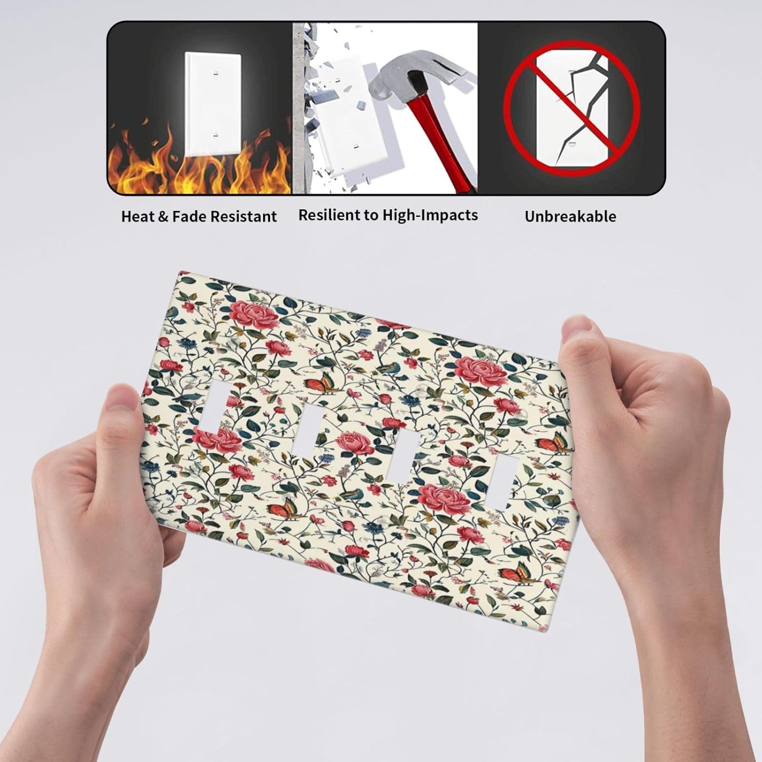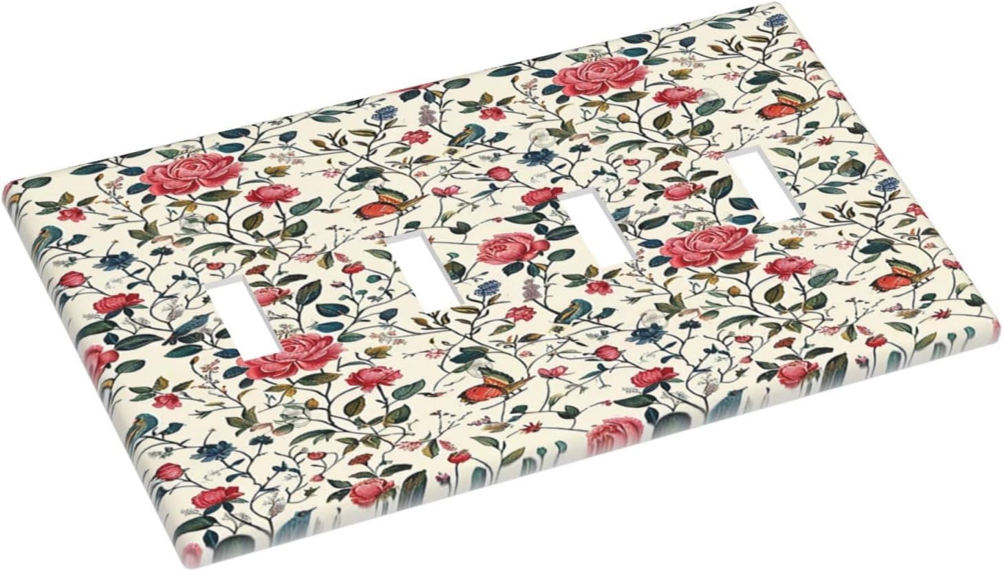 Light Switch Covers Vintage Flowers Rose Leaf Bird Butterfly Quad Toggle Electrical Faceplate 4 Gang Wall Plate Decorative Switch Plates for Bedroom living Room Decor