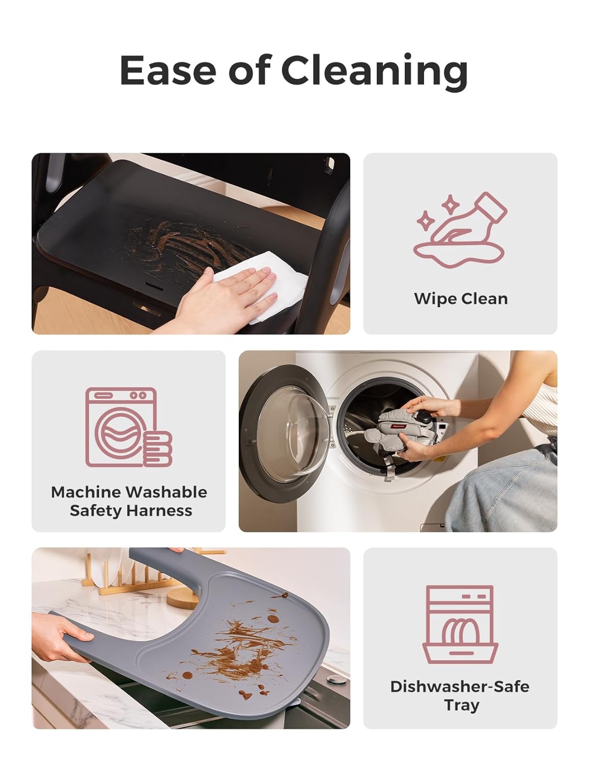 - Cleaning Made Easy: This high chair delivers maximum cleaning convenience. Its wipeable surface enables quick removal of spills with a damp cloth. The tray rinses quickly and is dishwasher-safe. The detachable five-point harness is machine washable.
