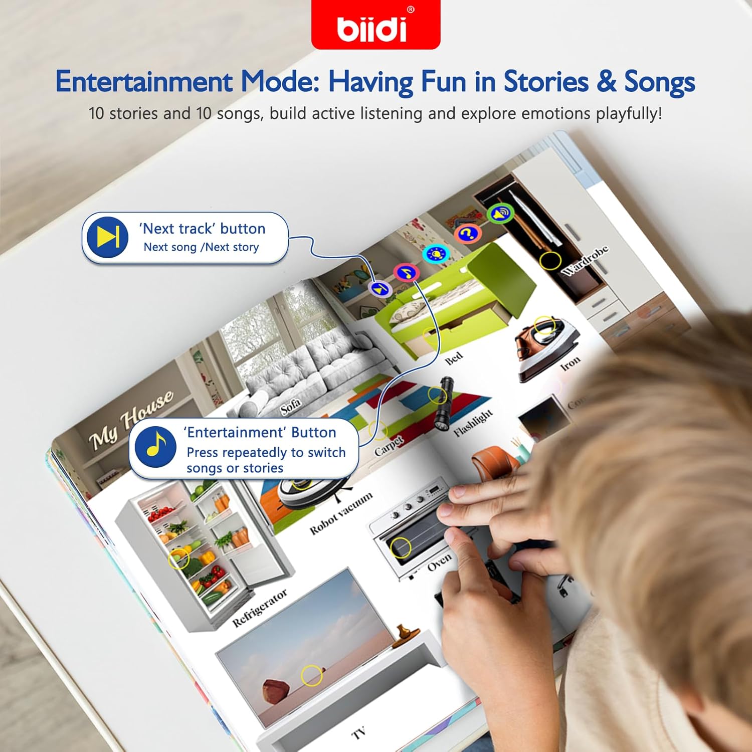 - 4 Smart Modes for Curious Kids : Word Mode (Press the yellow dots to hear sounds + words—great for vocabulary!);Learn More Mode: Learn more about the fun facts ; Guessing Game Mode: Praise for correct answers-boosts confidence!Entertainment Mode:10 super-catchy kids' songs,10 beloved storytime classics, builds rhythm and language skills while they bop.