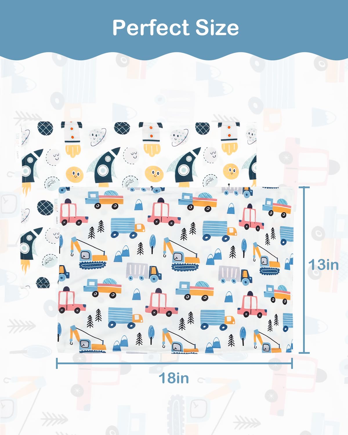 - Perfect Size -pillowcase fits 13x18 inches pillows,also loose fits 12x16 inches toddler pillows, travel pillows,neck pillow,toddler pillow,knee pillow or other small pillows.Unisex boys or girls.Perfect for travel,pre-school naps,bedtime.Pillowcase are special designed for 2 to 6 year olds as their first pillow.
