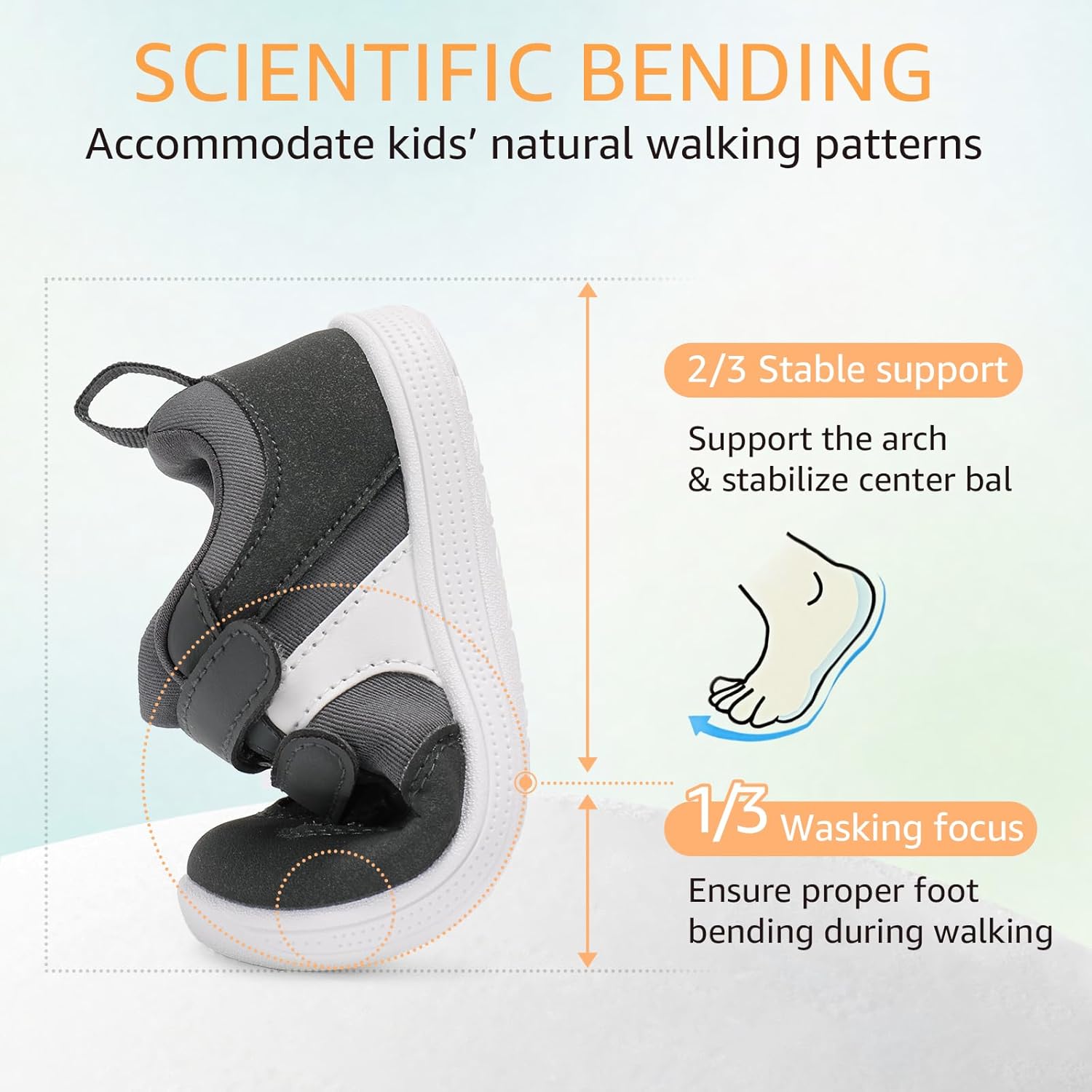 • [ Non-Slip Outsole ]: The treaded sole of these toddler first walking shoes offers excellent grip to help prevent slips and keep kids safe during play. The flexible 1/3 groove supports natural foot movement, perfect for active steps
